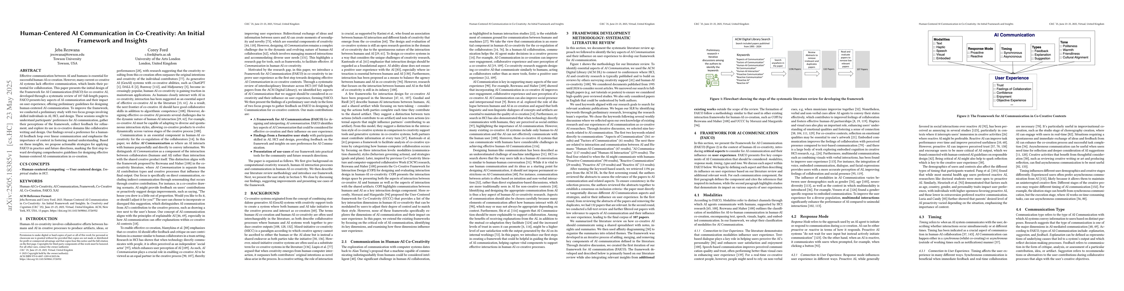 This work introduces FAICO, an initial framework for human-centered AI communication in co-creativity, distinguishing itself by emphasizing the importance of context and human-AI feedback loops.