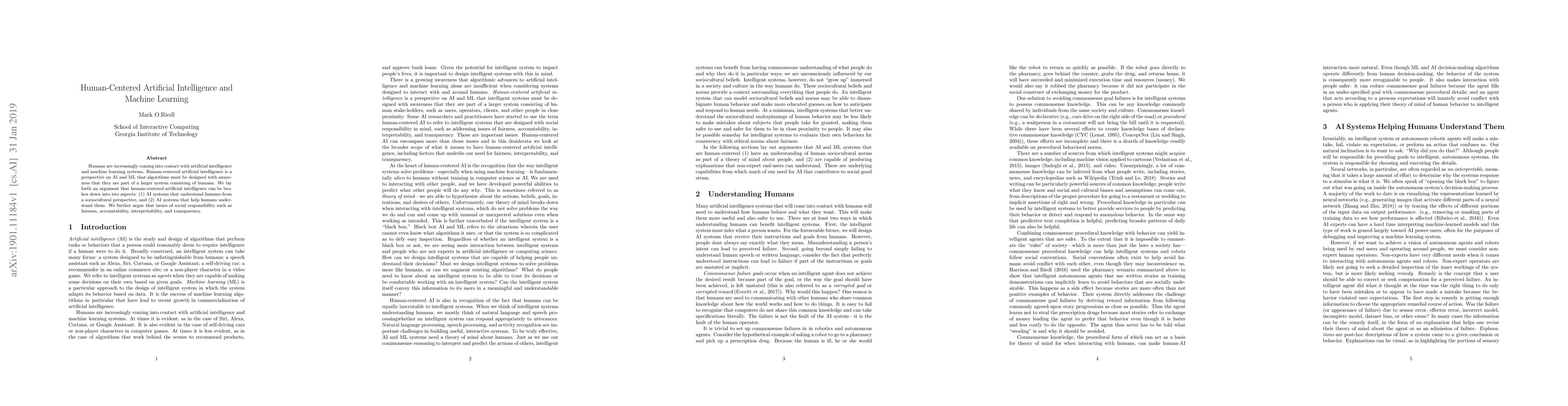 This paper explores human-centered artificial intelligence, emphasizing the need for AI systems to consider human sociocultural contexts and to aid humans in understanding AI. It also highlights the importance of social responsibility issues like fairness, accountability, interpretability, and transparency in AI design.