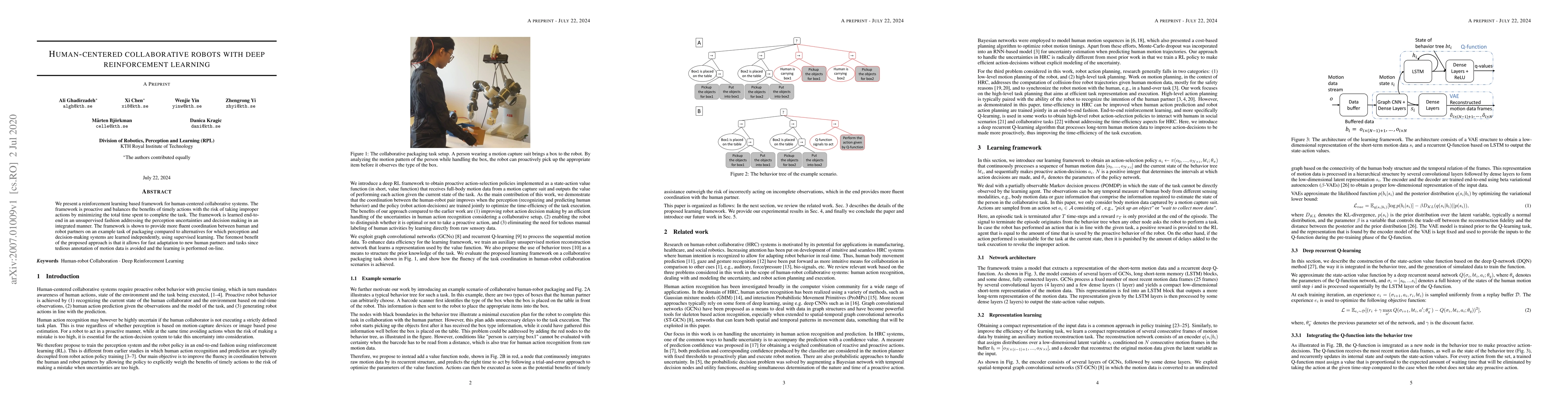 We present a reinforcement learning based framework for human-centered collaborative systems. The framework is proactive and balances the benefits of timely actions with the risk of taking improper actions by minimizing the total time spent to complete the task. The framework is learned end-to-end in an unsupervised fashion addressing the perception uncertainties and decision making in an integrated manner. The framework is shown to provide more fluent coordination between human and robot partners on an example task of packaging compared to alternatives for which perception and decision-making systems are learned independently, using supervised learning. The foremost benefit of the proposed approach is that it allows for fast adaptation to new human partners and tasks since tedious annotation of motion data is avoided and the learning is performed on-line.
