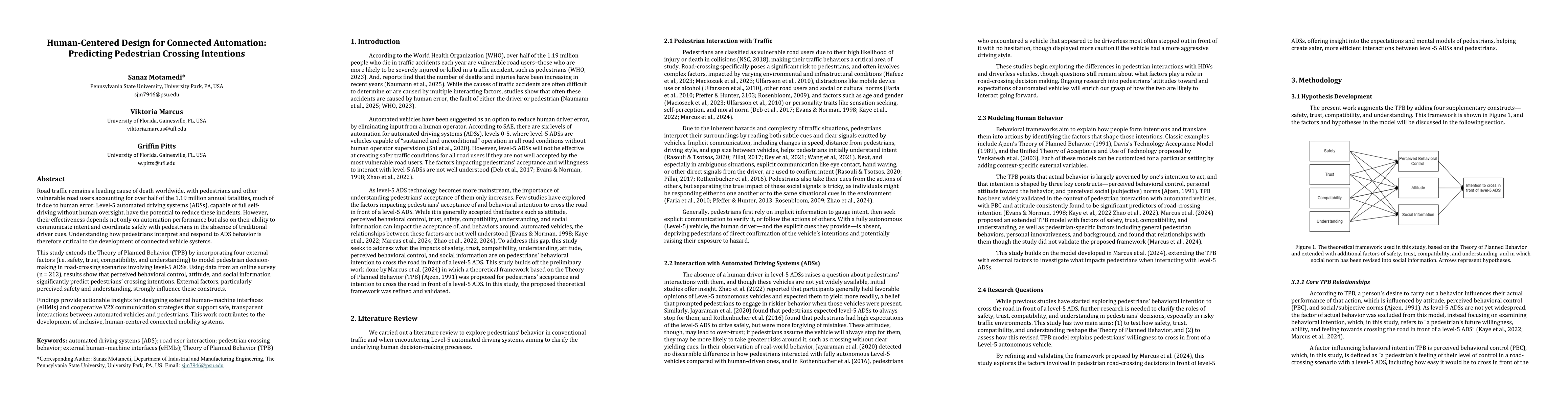 Road traffic remains a leading cause of death worldwide, with pedestrians and other vulnerable road users accounting for over half of the 1.19 million annual fatalities, much of it due to human error. Level-5 automated driving systems (ADSs), capable of full self-driving without human oversight, have the potential to reduce these incidents. However, their effectiveness depends not only on automation performance but also on their ability to communicate intent and coordinate safely with pedestrians in the absence of traditional driver cues. Understanding how pedestrians interpret and respond to ADS behavior is therefore critical to the development of connected vehicle systems. This study extends the Theory of Planned Behavior (TPB) by incorporating four external factors (i.e. safety, trust, compatibility, and understanding) to model pedestrian decision-making in road-crossing scenarios involving level-5 ADSs. Using data from an online survey (n = 212), results show that perceived behavioral control, attitude, and social information significantly predict pedestrians' crossing intentions. External factors, particularly perceived safety and understanding, strongly influence these constructs. Findings provide actionable insights for designing external human-machine interfaces (eHMIs) and cooperative V2X communication strategies that support safe, transparent interactions between automated vehicles and pedestrians. This work contributes to the development of inclusive, human-centered connected mobility systems.