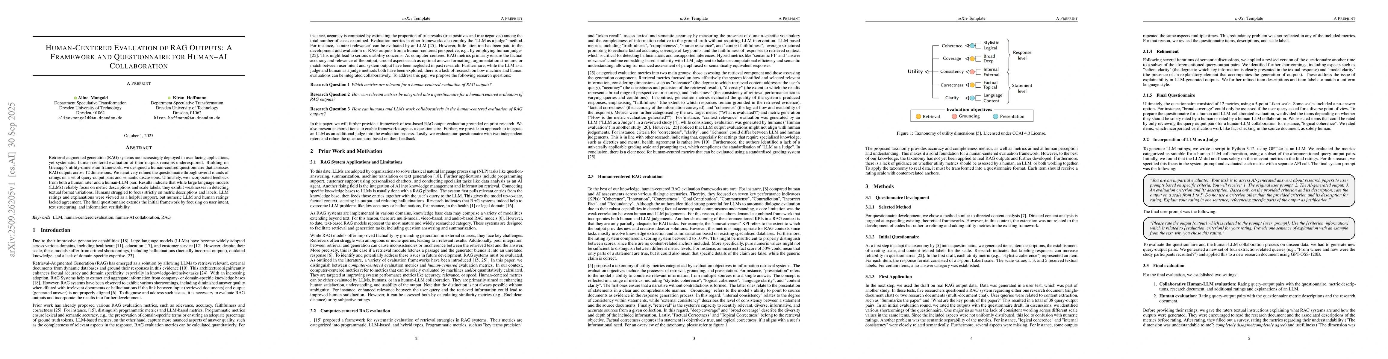 Retrieval-augmented generation (RAG) systems are increasingly deployed in user-facing applications, yet systematic, human-centered evaluation of their outputs remains underexplored. Building on Gienapp's utility-dimension framework, we designed a human-centred questionnaire that assesses RAG outputs across 12 dimensions. We iteratively refined the questionnaire through several rounds of ratings on a set of query-output pairs and semantic discussions. Ultimately, we incorporated feedback from both a human rater and a human-LLM pair. Results indicate that while large language models (LLMs) reliably focus on metric descriptions and scale labels, they exhibit weaknesses in detecting textual format variations. Humans struggled to focus strictly on metric descriptions and labels. LLM ratings and explanations were viewed as a helpful support, but numeric LLM and human ratings lacked agreement. The final questionnaire extends the initial framework by focusing on user intent, text structuring, and information verifiability.