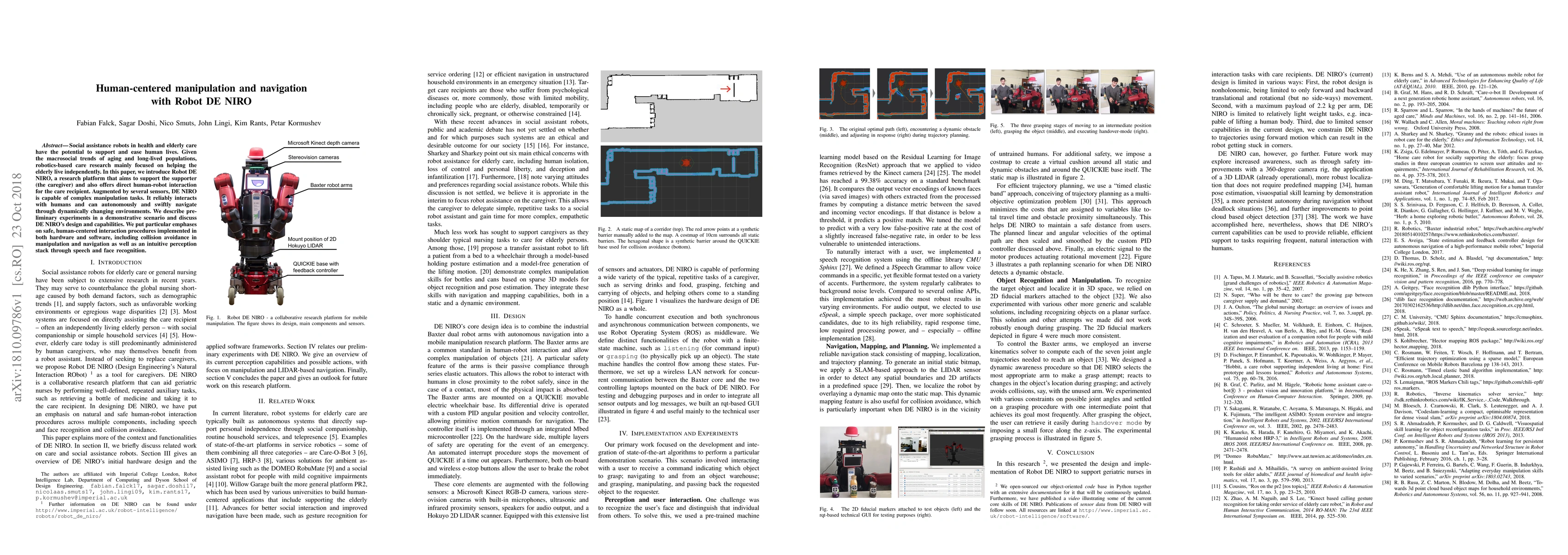Social assistance robots in health and elderly care have the potential to support and ease human lives. Given the macrosocial trends of aging and long-lived populations, robotics-based care research mainly focused on helping the elderly live independently. In this paper, we introduce Robot DE NIRO, a research platform that aims to support the supporter (the caregiver) and also offers direct human-robot interaction for the care recipient. Augmented by several sensors, DE NIRO is capable of complex manipulation tasks. It reliably interacts with humans and can autonomously and swiftly navigate through dynamically changing environments. We describe preliminary experiments in a demonstrative scenario and discuss DE NIRO's design and capabilities. We put particular emphases on safe, human-centered interaction procedures implemented in both hardware and software, including collision avoidance in manipulation and navigation as well as an intuitive perception stack through speech and face recognition.