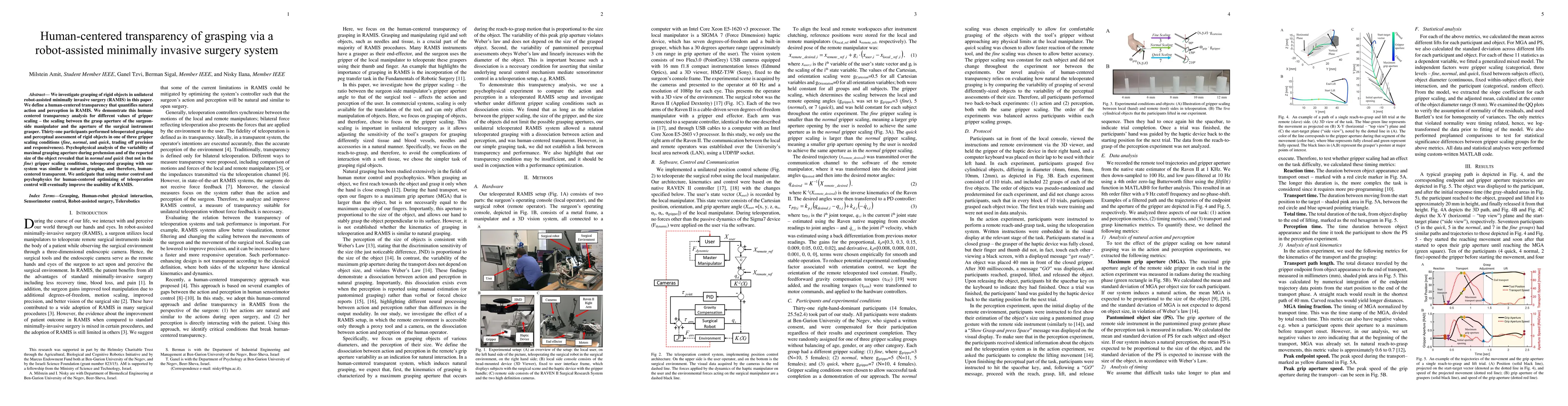 We investigate grasping of rigid objects in unilateral robot-assisted minimally invasive surgery (RAMIS) in this paper. We define a human-centered transparency that quantifies natural action and perception in RAMIS. We demonstrate this human-centered transparency analysis for different values of gripper scaling - the scaling between the grasp aperture of the surgeon-side manipulator and the aperture of the surgical instrument grasper. Thirty-one participants performed teleoperated grasping and perceptual assessment of rigid objects in one of three gripper scaling conditions (fine, normal, and quick, trading off precision and responsiveness). Psychophysical analysis of the variability of maximal grasping aperture during prehension and of the reported size of the object revealed that in normal and quick (but not in the fine) gripper scaling conditions, teleoperated grasping with our system was similar to natural grasping, and therefore, human-centered transparent. We anticipate that using motor control and psychophysics for human-centered optimizing of teleoperation control will eventually improve the usability of RAMIS.