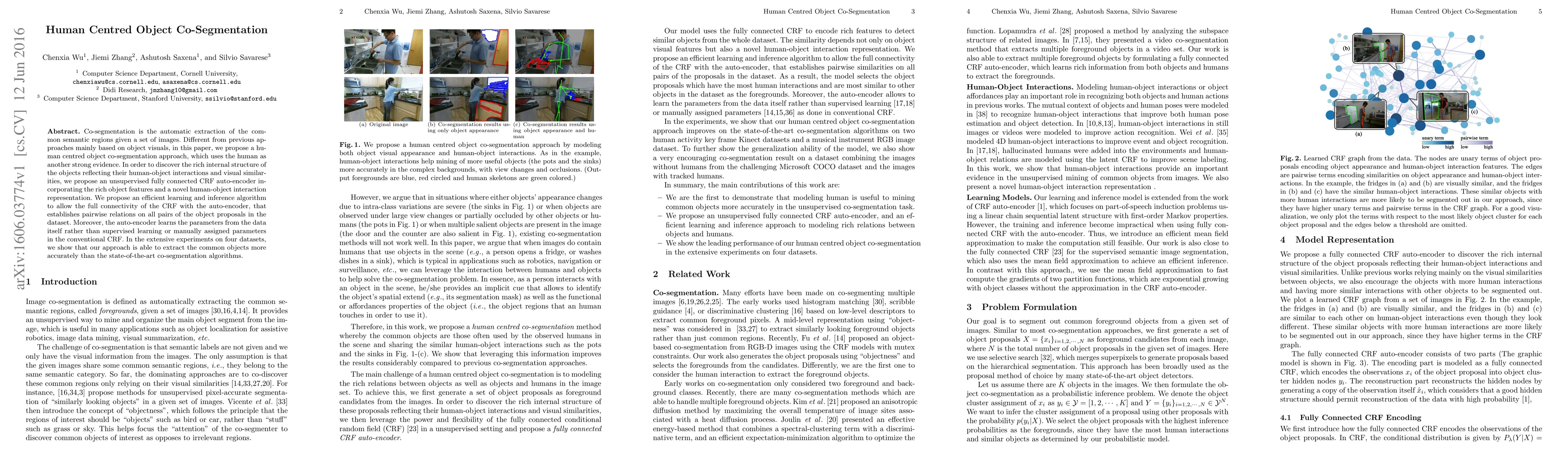 The paper proposes a human-centered object co-segmentation approach using a fully connected CRF auto-encoder. It incorporates rich object features and a novel human-object interaction representation, learned from data without supervision or manual parameter assignment.