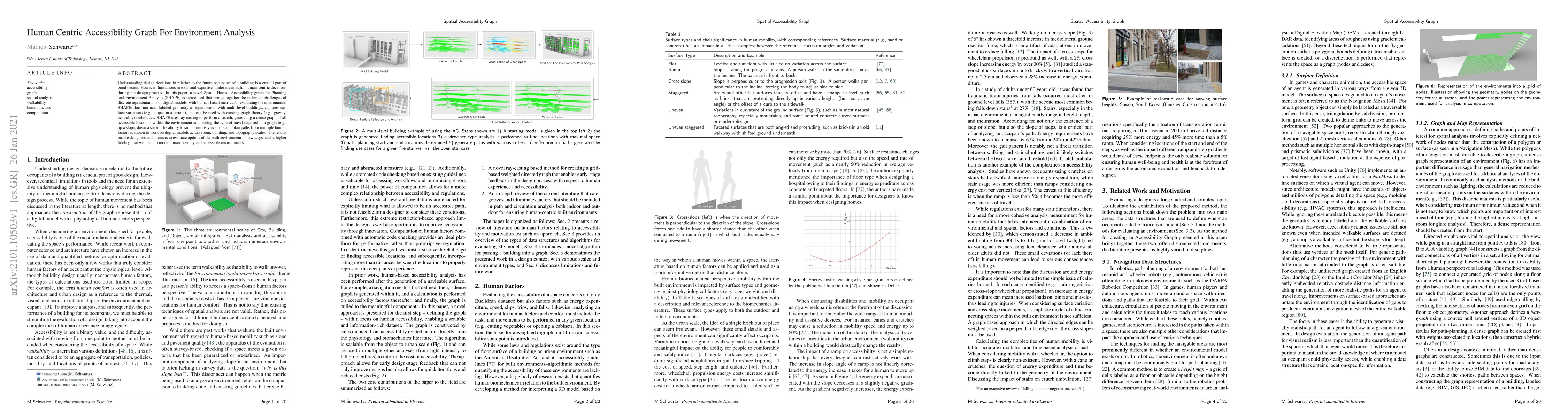 Understanding design decisions in relation to the future occupants of a building is a crucial part of good design. However, limitations in tools and expertise hinder meaningful human-centric decisions during the design process. In this paper, a novel Spatial Human Accessibility graph for Planning and Environment Analysis (SHAPE) is introduced that brings together the technical challenges of discrete representations of digital models, with human-based metrics for evaluating the environment. SHAPE: does not need labeled geometry as input, works with multi-level buildings, captures surface variations (e.g., slopes in a terrain), and can be used with existing graph theory (e.g., gravity, centrality) techniques. SHAPE uses ray-casting to perform a search, generating a dense graph of all accessible locations within the environment and storing the type of travel required in a graph (e.g., up a slope, down a step). The ability to simultaneously evaluate and plan paths from multiple human factors is shown to work on digital models across room, building, and topography scales. The results enable designers and planners to evaluate options of the built environment in new ways, and at higher fidelity, that will lead to more human-friendly and accessible environments.