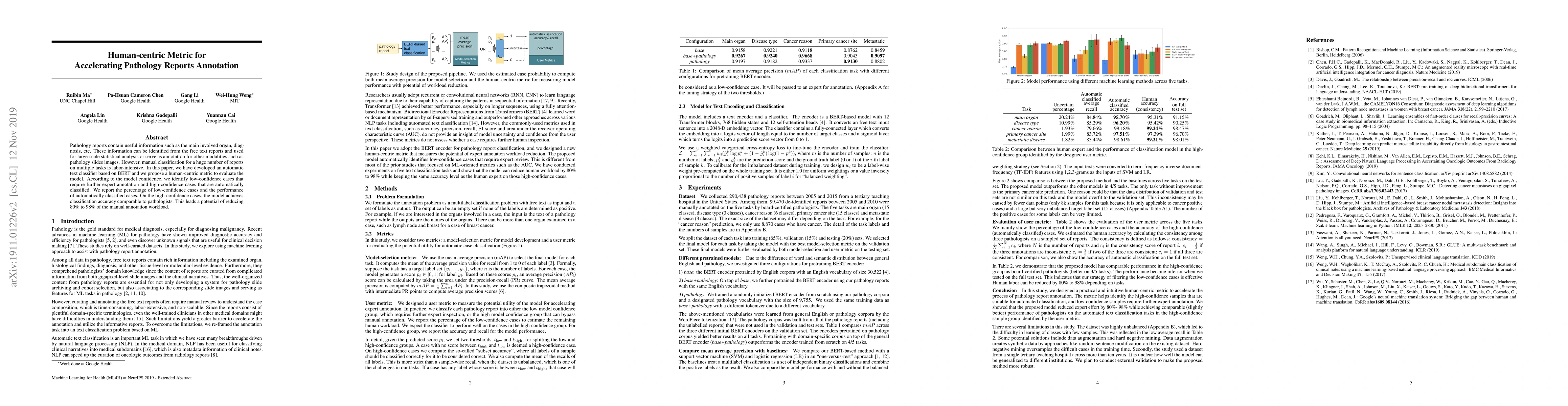 Pathology reports contain useful information such as the main involved organ, diagnosis, etc. These information can be identified from the free text reports and used for large-scale statistical analysis or serve as annotation for other modalities such as pathology slides images. However, manual classification for a huge number of reports on multiple tasks is labor-intensive. In this paper, we have developed an automatic text classifier based on BERT and we propose a human-centric metric to evaluate the model. According to the model confidence, we identify low-confidence cases that require further expert annotation and high-confidence cases that are automatically classified. We report the percentage of low-confidence cases and the performance of automatically classified cases. On the high-confidence cases, the model achieves classification accuracy comparable to pathologists. This leads a potential of reducing 80% to 98% of the manual annotation workload.