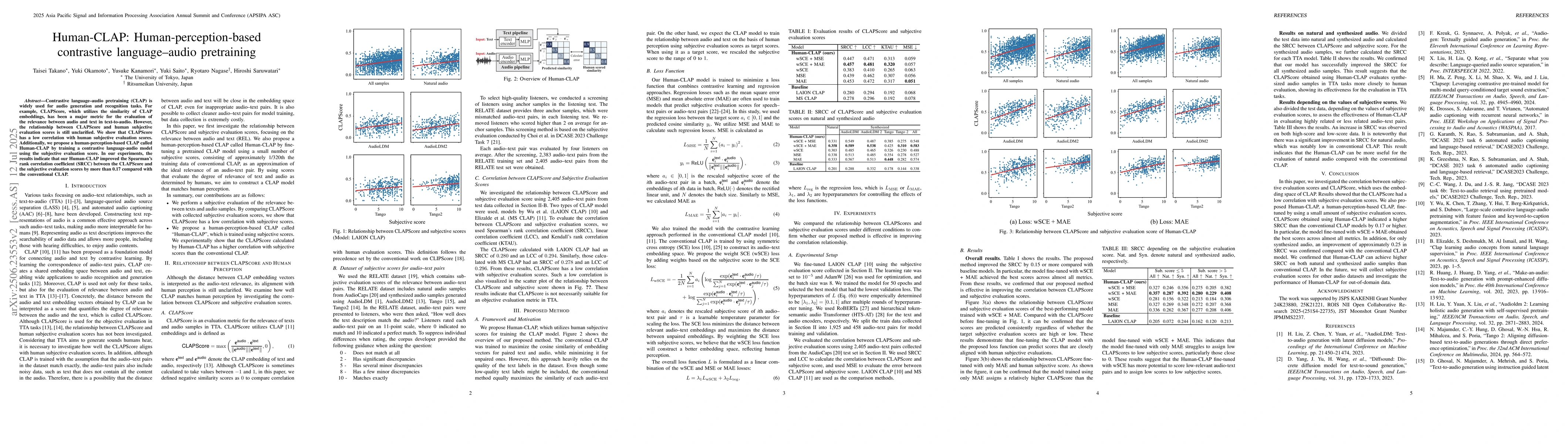 Human-CLAP, a human-perception-based contrastive language-audio pretraining model that fine-tunes a CLAP model using subjective evaluation scores to improve the correlation between CLAPScore and human perception.