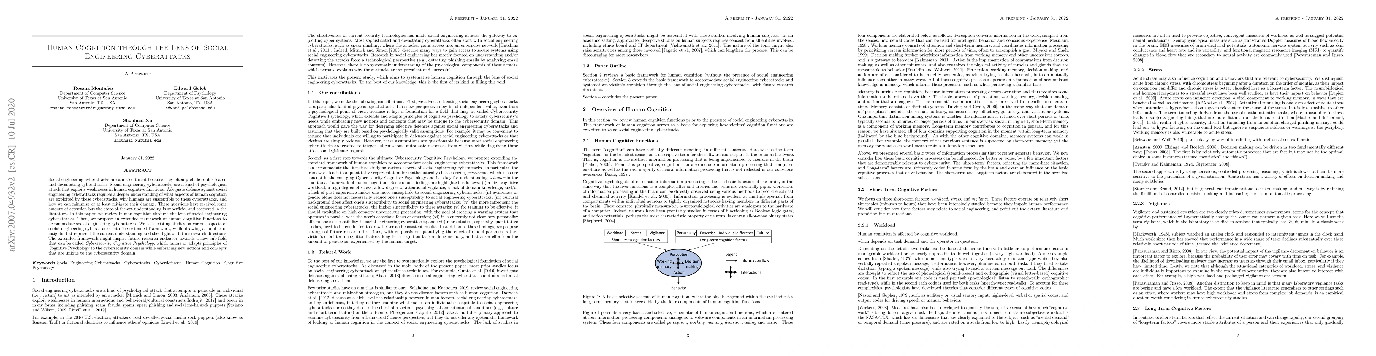 This paper reviews human cognition in the context of social engineering cyberattacks, proposing an extended framework to better understand cognitive vulnerabilities exploited by these attacks. It aims to inspire a new sub-field, Cybersecurity Cognitive Psychology, by integrating principles of Cognitive Psychology with cybersecurity concepts.