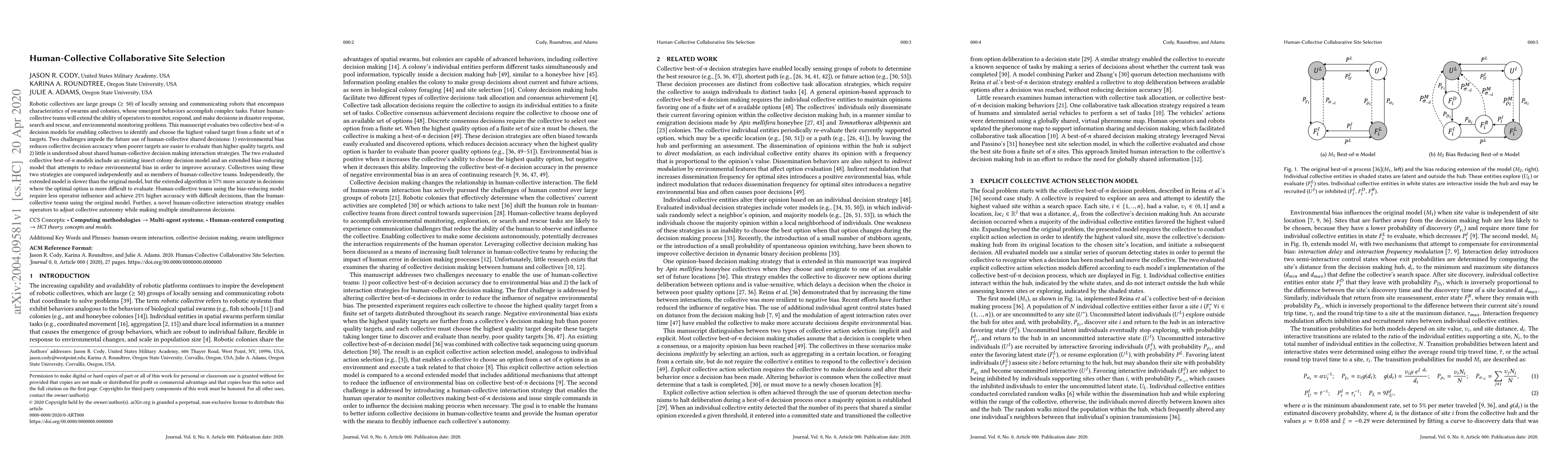Robotic collectives are large groups (at least 50) of locally sensing and communicating robots that encompass characteristics of swarms and colonies, whose emergent behaviors accomplish complex tasks. Future human-collective teams will extend the ability of operators to monitor, respond, and make decisions in disaster response, search and rescue, and environmental monitoring problems. This manuscript evaluates two collective best-of-n decision models for enabling collectives to identify and choose the highest valued target from a finite set of n targets. Two challenges impede the future use of human-collective shared decisions: 1) environmental bias reduces collective decision accuracy when poorer targets are easier to evaluate than higher quality targets, and 2) little is understood about shared human-collective decision making interaction strategies. The two evaluated collective best-of-n models include an existing insect colony decision model and an extended bias-reducing model that attempts to reduce environmental bias in order to improve accuracy. Collectives using these two strategies are compared independently and as members of human-collective teams. Independently, the extended model is slower than the original model, but the extended algorithm is 57% more accurate in decisions where the optimal option is more difficult to evaluate. Human-collective teams using the bias-reducing model require less operator influence and achieve 25% higher accuracy with difficult decisions, than the human-collective teams using the original model. Further, a novel human-collective interaction strategy enables operators to adjust collective autonomy while making multiple simultaneous decisions.