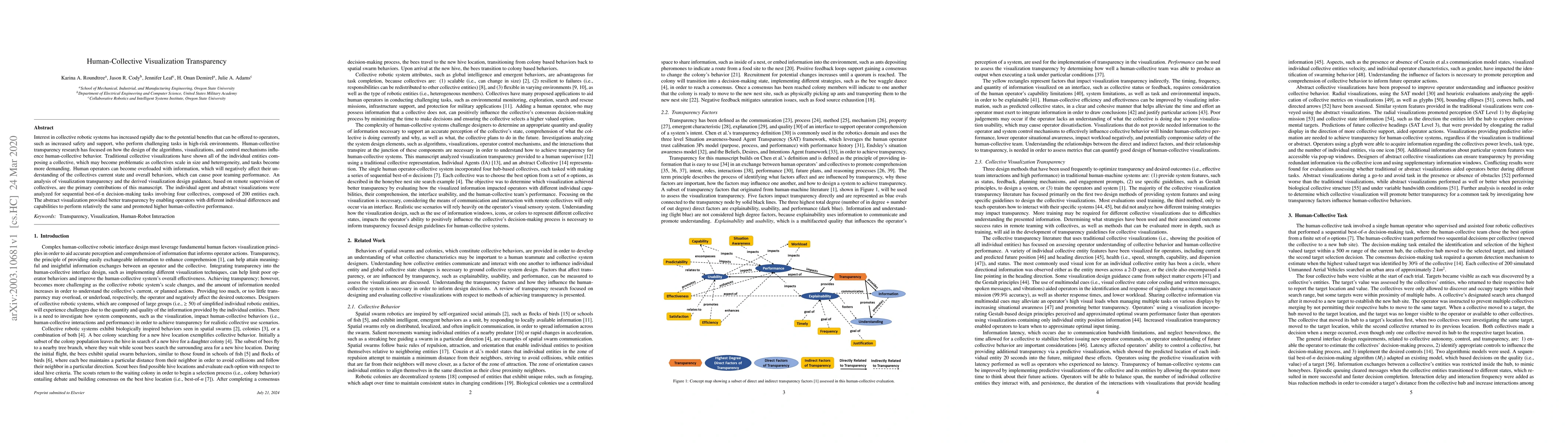 Interest in collective robotic systems has increased rapidly due to the potential benefits that can be offered to operators, such as increased safety and support, who perform challenging tasks in high-risk environments. Human-collective transparency research has focused on how the design of the algorithms, visualizations, and control mechanisms influence human-collective behavior. Traditional collective visualizations have shown all of the individual entities composing a collective, which may become problematic as collectives scale in size and heterogeneity, and tasks become more demanding. Human operators can become overloaded with information, which will negatively affect their understanding of the collective's current state and overall behaviors, which can cause poor teaming performance. An analysis of visualization transparency and the derived visualization design guidance, based on remote supervision of collectives, are the primary contributions of this manuscript. The individual agent and abstract visualizations were analyzed for sequential best-of-n decision-making tasks involving four collectives, composed of 200 entities each. The abstract visualization provided better transparency by enabling operators with different individual differences and capabilities to perform relatively the same and promoted higher human-collective performance.