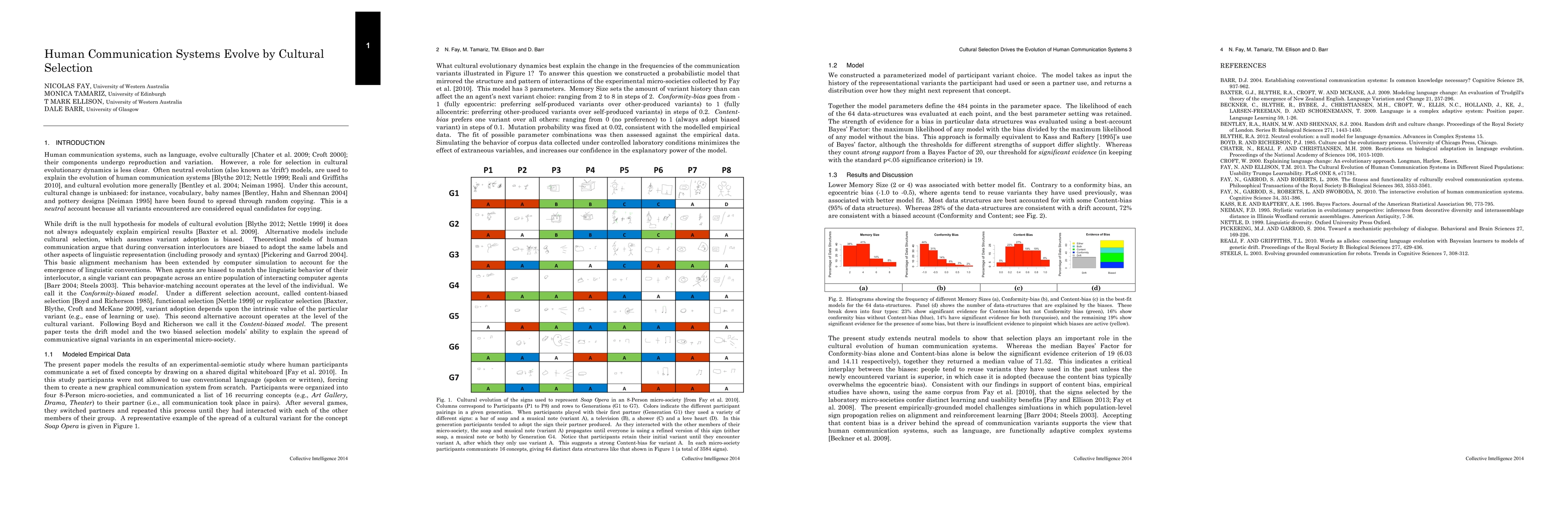 Human communication systems, such as language, evolve culturally; their components undergo reproduction and variation. However, a role for selection in cultural evolutionary dynamics is less clear. Often neutral evolution (also known as 'drift') models, are used to explain the evolution of human communication systems, and cultural evolution more generally. Under this account, cultural change is unbiased: for instance, vocabulary, baby names and pottery designs have been found to spread through random copying. While drift is the null hypothesis for models of cultural evolution it does not always adequately explain empirical results. Alternative models include cultural selection, which assumes variant adoption is biased. Theoretical models of human communication argue that during conversation interlocutors are biased to adopt the same labels and other aspects of linguistic representation (including prosody and syntax). This basic alignment mechanism has been extended by computer simulation to account for the emergence of linguistic conventions. When agents are biased to match the linguistic behavior of their interlocutor, a single variant can propagate across an entire population of interacting computer agents. This behavior-matching account operates at the level of the individual. We call it the Conformity-biased model. Under a different selection account, called content-biased selection, functional selection or replicator selection, variant adoption depends upon the intrinsic value of the particular variant (e.g., ease of learning or use). This second alternative account operates at the level of the cultural variant. Following Boyd and Richerson we call it the Content-biased model. The present paper tests the drift model and the two biased selection models' ability to explain the spread of communicative signal variants in an experimental micro-society.