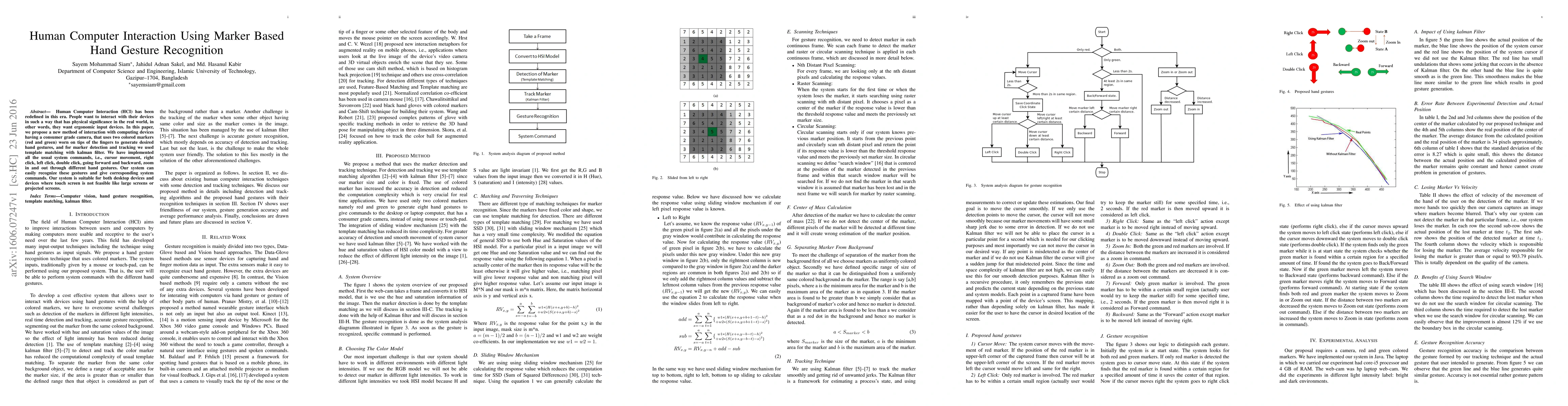 Human Computer Interaction (HCI) has been redefined in this era. People want to interact with their devices in such a way that has physical significance in the real world, in other words, they want ergonomic input devices. In this paper, we propose a new method of interaction with computing devices having a consumer grade camera, that uses two colored markers (red and green) worn on tips of the fingers to generate desired hand gestures, and for marker detection and tracking we used template matching with kalman filter. We have implemented all the usual system commands, i.e., cursor movement, right click, left click, double click, going forward and backward, zoom in and out through different hand gestures. Our system can easily recognize these gestures and give corresponding system commands. Our system is suitable for both desktop devices and devices where touch screen is not feasible like large screens or projected screens.