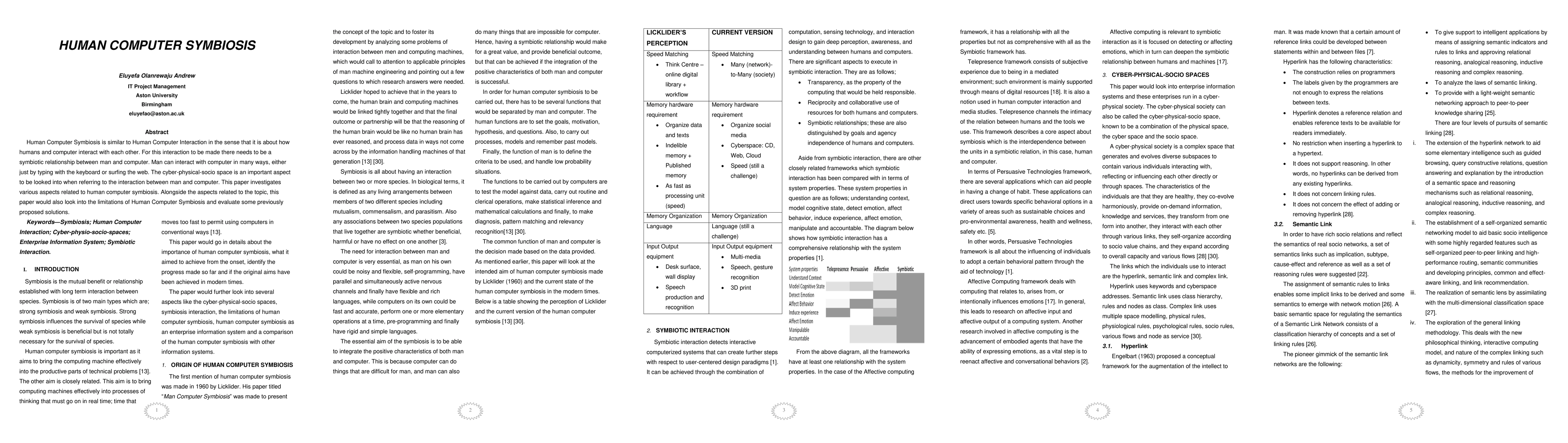 The paper discusses Human Computer Symbiosis, examining its aspects, limitations, and proposing solutions through various research areas like hyperlink, semantic link, complex link, and cyber-physical-socio space.