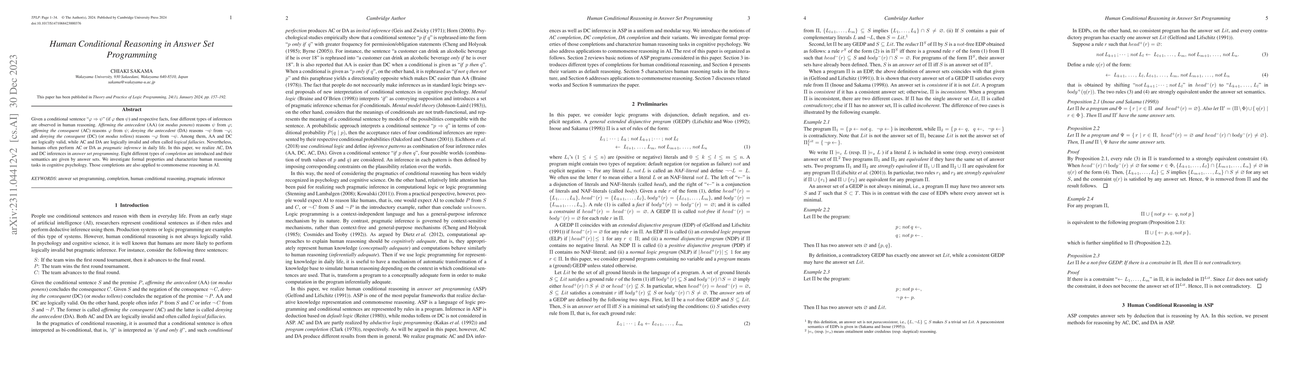 This paper explores human conditional reasoning through answer set programming, focusing on four types of inferences: affirming the antecedent, affirming the consequent, denying the antecedent, and denying the consequent. It introduces eight completions for these inferences, grounded in answer set semantics, and examines their formal properties and applications to commonsense reasoning in AI.