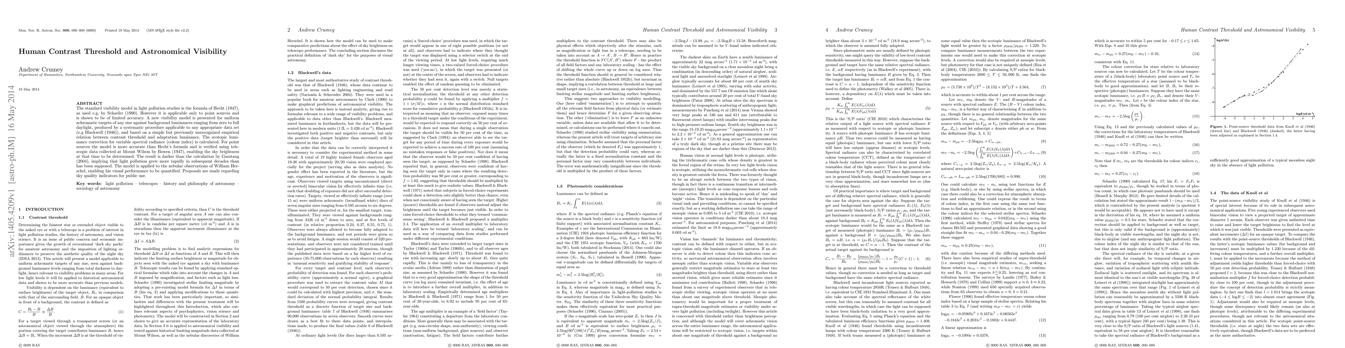 The standard visibility model in light pollution studies is the formula of Hecht (1947), as used e.g. by Schaefer (1990). However it is applicable only to point sources and is shown to be of limited accuracy. A new visibility model is presented for uniform achromatic targets of any size against background luminances ranging from zero to full daylight, produced by a systematic procedure applicable to any appropriate data set (e.g Blackwell (1946)), and based on a simple but previously unrecognized empirical relation between contrast threshold and adaptation luminance. The scotopic luminance correction for variable spectral radiance (colour index) is calculated. For point sources the model is more accurate than Hecht's formula and is verified using telescopic data collected at Mount Wilson by Bowen (1947), enabling the sky brightness at that time to be determined. The result is darker than the calculation by Garstang (2004), implying that light pollution grew more rapidly in subsequent decades than has been supposed. The model is applied to the nebular observations of William Herschel, enabling his visual performance to be quantified. Proposals are made regarding sky quality indicators for public use.