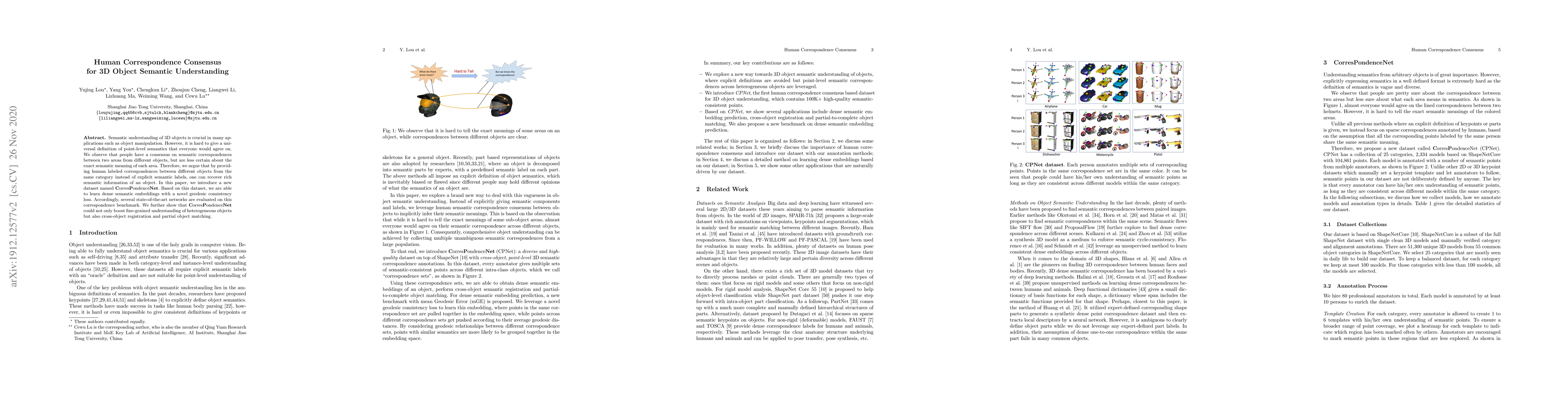Semantic understanding of 3D objects is crucial in many applications such as object manipulation. However, it is hard to give a universal definition of point-level semantics that everyone would agree on. We observe that people have a consensus on semantic correspondences between two areas from different objects, but are less certain about the exact semantic meaning of each area. Therefore, we argue that by providing human labeled correspondences between different objects from the same category instead of explicit semantic labels, one can recover rich semantic information of an object. In this paper, we introduce a new dataset named CorresPondenceNet. Based on this dataset, we are able to learn dense semantic embeddings with a novel geodesic consistency loss. Accordingly, several state-of-the-art networks are evaluated on this correspondence benchmark. We further show that CorresPondenceNet could not only boost fine-grained understanding of heterogeneous objects but also cross-object registration and partial object matching.