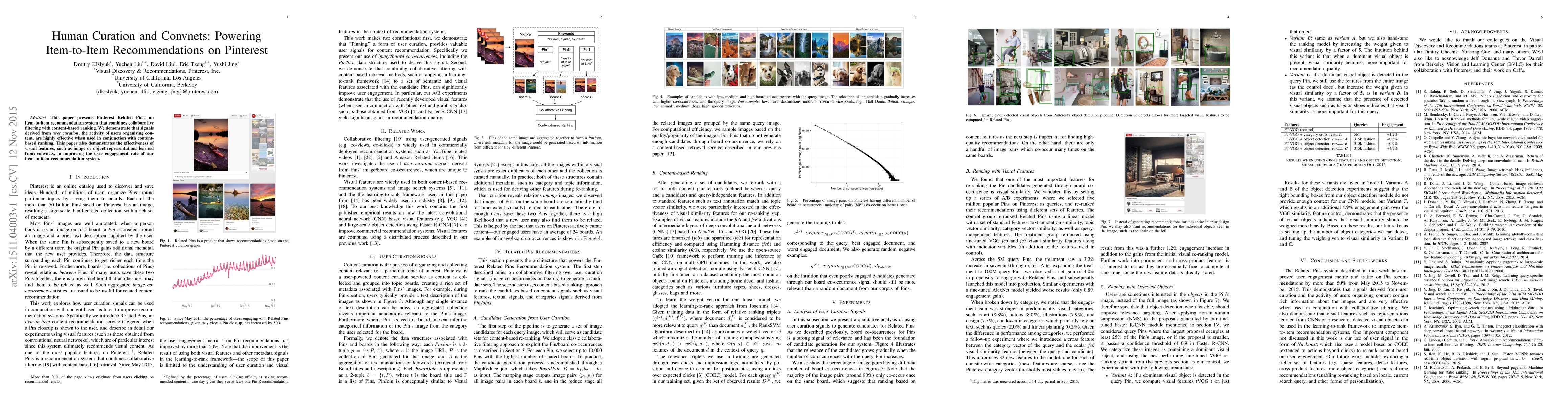 This paper introduces Pinterest Related Pins, a recommendation system that leverages user curation and visual features from ConvNets to improve item-to-item recommendations on Pinterest. It demonstrates the effectiveness of combining collaborative filtering with content-based ranking and visual features in enhancing user engagement rates.