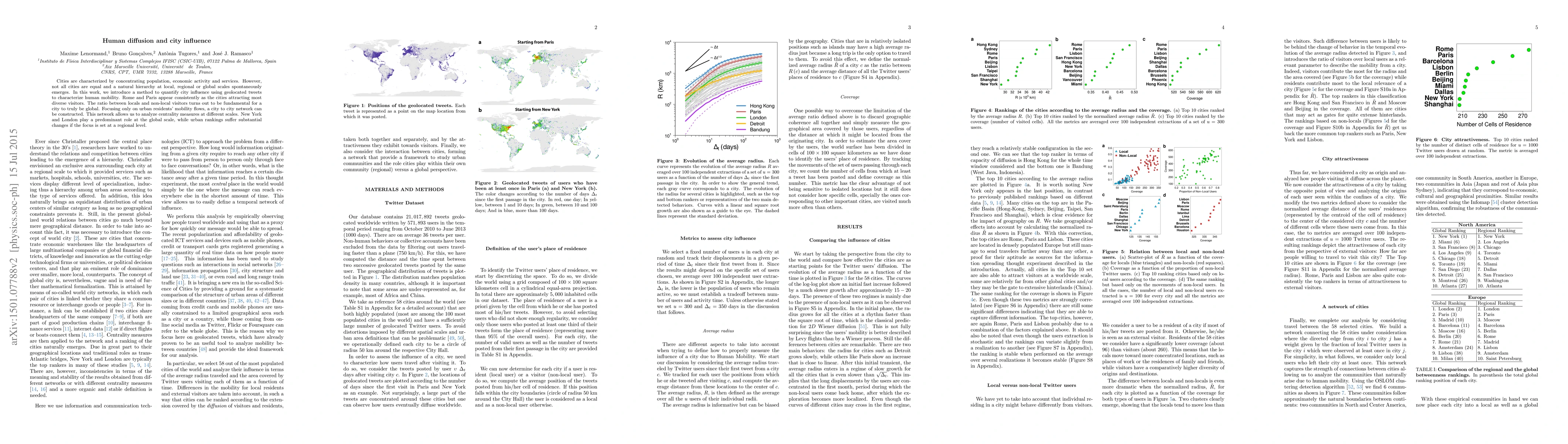 Cities are characterized by concentrating population, economic activity and services. However, not all cities are equal and a natural hierarchy at local, regional or global scales spontaneously emerges. In this work, we introduce a method to quantify city influence using geolocated tweets to characterize human mobility. Rome and Paris appear consistently as the cities attracting most diverse visitors. The ratio between locals and non-local visitors turns out to be fundamental for a city to truly be global. Focusing only on urban residents' mobility flows, a city to city network can be constructed. This network allows us to analyze centrality measures at different scales. New York and London play a predominant role at the global scale, while urban rankings suffer substantial changes if the focus is set at a regional level.