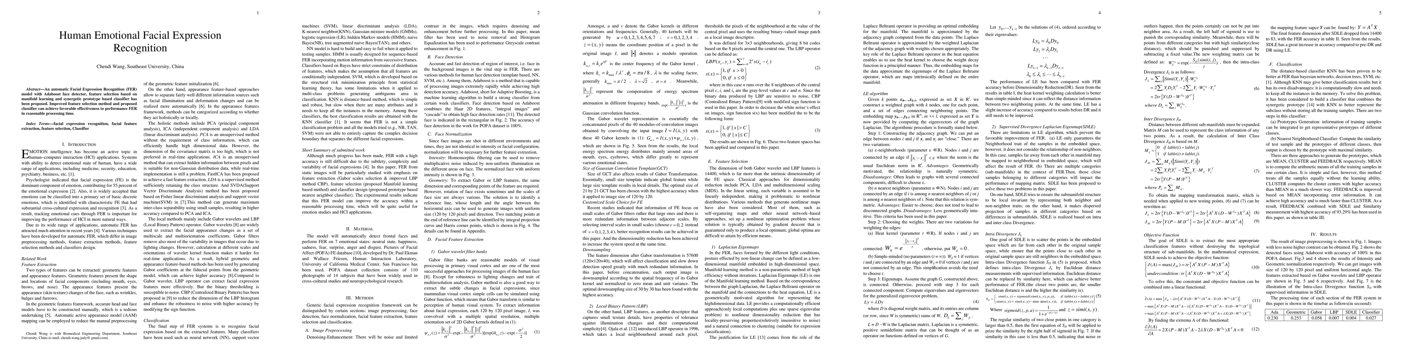 An automatic Facial Expression Recognition (FER) model with Adaboost face detector, feature selection based on manifold learning and synergetic prototype based classifier has been proposed. Improved feature selection method and proposed classifier can achieve favorable effectiveness to performance FER in reasonable processing time.