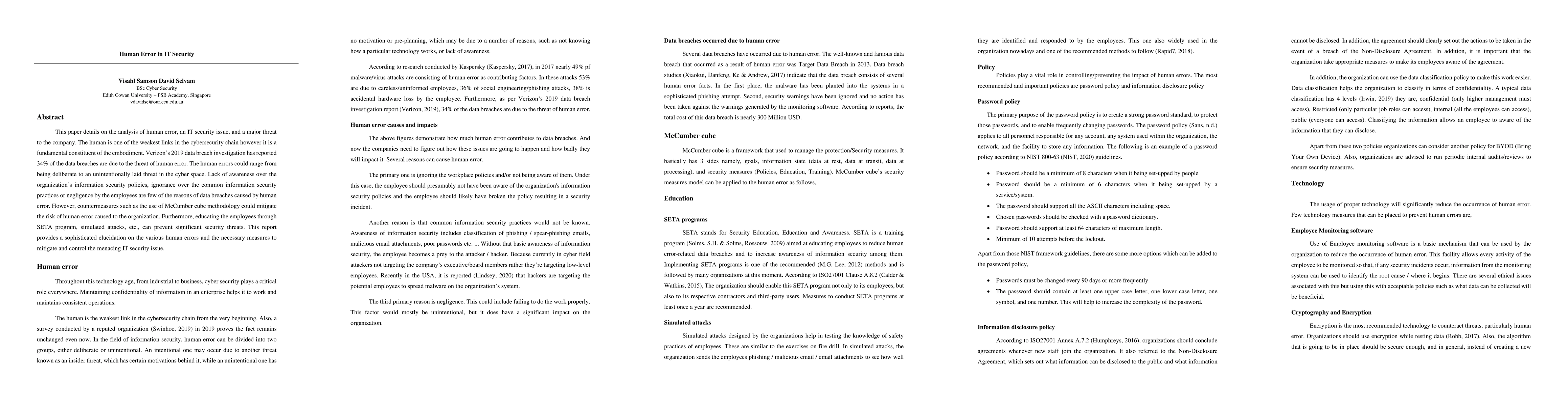 This paper details on the analysis of human error, an IT security issue, and a major threat to the company. The human is one of the weakest links in the cybersecurity chain however it is a fundamental constituent of the embodiment. This report provides a sophisticated elucidation on the various human errors and the necessary measures to mitigate and control the menacing IT security issue.