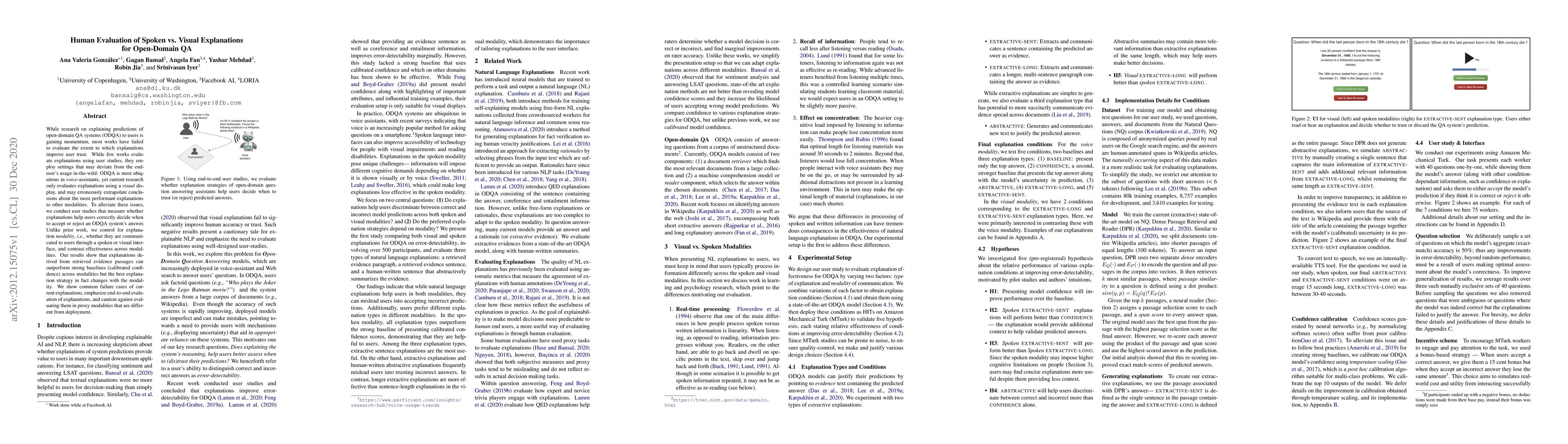 While research on explaining predictions of open-domain QA systems (ODQA) to users is gaining momentum, most works have failed to evaluate the extent to which explanations improve user trust. While few works evaluate explanations using user studies, they employ settings that may deviate from the end-user's usage in-the-wild: ODQA is most ubiquitous in voice-assistants, yet current research only evaluates explanations using a visual display, and may erroneously extrapolate conclusions about the most performant explanations to other modalities. To alleviate these issues, we conduct user studies that measure whether explanations help users correctly decide when to accept or reject an ODQA system's answer. Unlike prior work, we control for explanation modality, e.g., whether they are communicated to users through a spoken or visual interface, and contrast effectiveness across modalities. Our results show that explanations derived from retrieved evidence passages can outperform strong baselines (calibrated confidence) across modalities but the best explanation strategy in fact changes with the modality. We show common failure cases of current explanations, emphasize end-to-end evaluation of explanations, and caution against evaluating them in proxy modalities that are different from deployment.