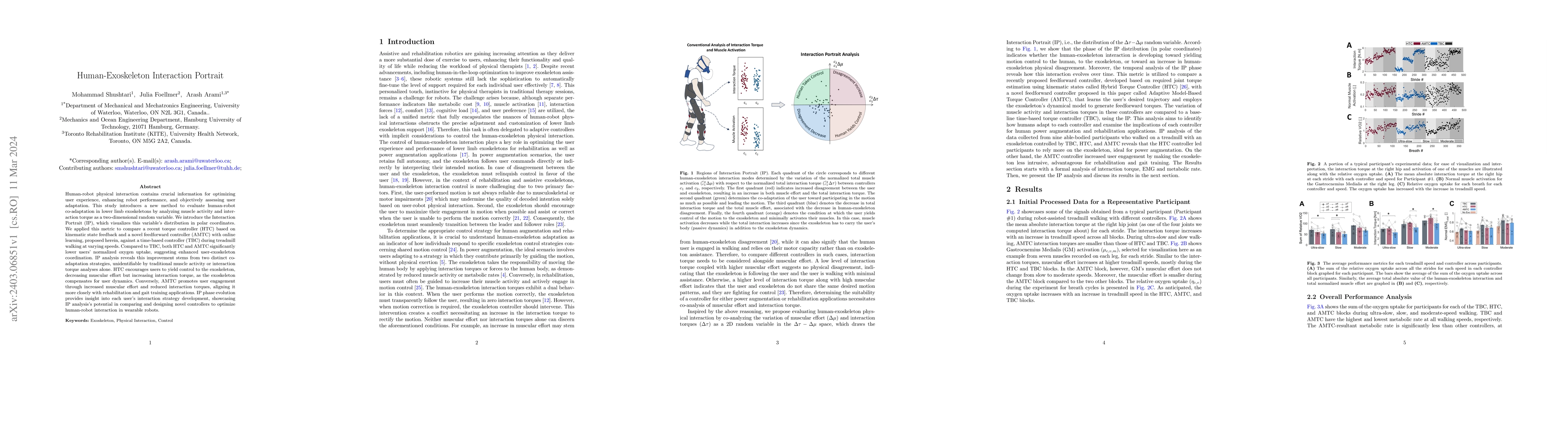 Human-robot physical interaction contains crucial information for optimizing user experience, enhancing robot performance, and objectively assessing user adaptation. This study introduces a new method to evaluate human-robot co-adaptation in lower limb exoskeletons by analyzing muscle activity and interaction torque as a two-dimensional random variable. We introduce the Interaction Portrait (IP), which visualizes this variable's distribution in polar coordinates. We applied this metric to compare a recent torque controller (HTC) based on kinematic state feedback and a novel feedforward controller (AMTC) with online learning, proposed herein, against a time-based controller (TBC) during treadmill walking at varying speeds. Compared to TBC, both HTC and AMTC significantly lower users' normalized oxygen uptake, suggesting enhanced user-exoskeleton coordination. IP analysis reveals this improvement stems from two distinct co-adaptation strategies, unidentifiable by traditional muscle activity or interaction torque analyses alone. HTC encourages users to yield control to the exoskeleton, decreasing muscular effort but increasing interaction torque, as the exoskeleton compensates for user dynamics. Conversely, AMTC promotes user engagement through increased muscular effort and reduced interaction torques, aligning it more closely with rehabilitation and gait training applications. IP phase evolution provides insight into each user's interaction strategy development, showcasing IP analysis's potential in comparing and designing novel controllers to optimize human-robot interaction in wearable robots.
