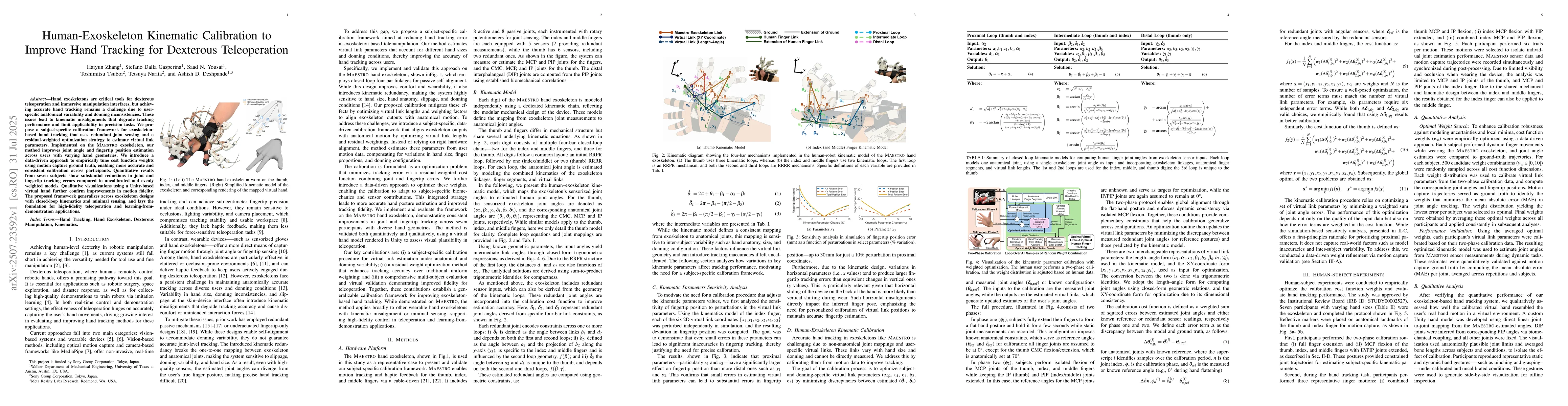 Hand exoskeletons are critical tools for dexterous teleoperation and immersive manipulation interfaces, but achieving accurate hand tracking remains a challenge due to user-specific anatomical variability and donning inconsistencies. These issues lead to kinematic misalignments that degrade tracking performance and limit applicability in precision tasks. We propose a subject-specific calibration framework for exoskeleton-based hand tracking that uses redundant joint sensing and a residual-weighted optimization strategy to estimate virtual link parameters. Implemented on the Maestro exoskeleton, our method improves joint angle and fingertip position estimation across users with varying hand geometries. We introduce a data-driven approach to empirically tune cost function weights using motion capture ground truth, enabling more accurate and consistent calibration across participants. Quantitative results from seven subjects show substantial reductions in joint and fingertip tracking errors compared to uncalibrated and evenly weighted models. Qualitative visualizations using a Unity-based virtual hand further confirm improvements in motion fidelity. The proposed framework generalizes across exoskeleton designs with closed-loop kinematics and minimal sensing, and lays the foundation for high-fidelity teleoperation and learning-from-demonstration applications.