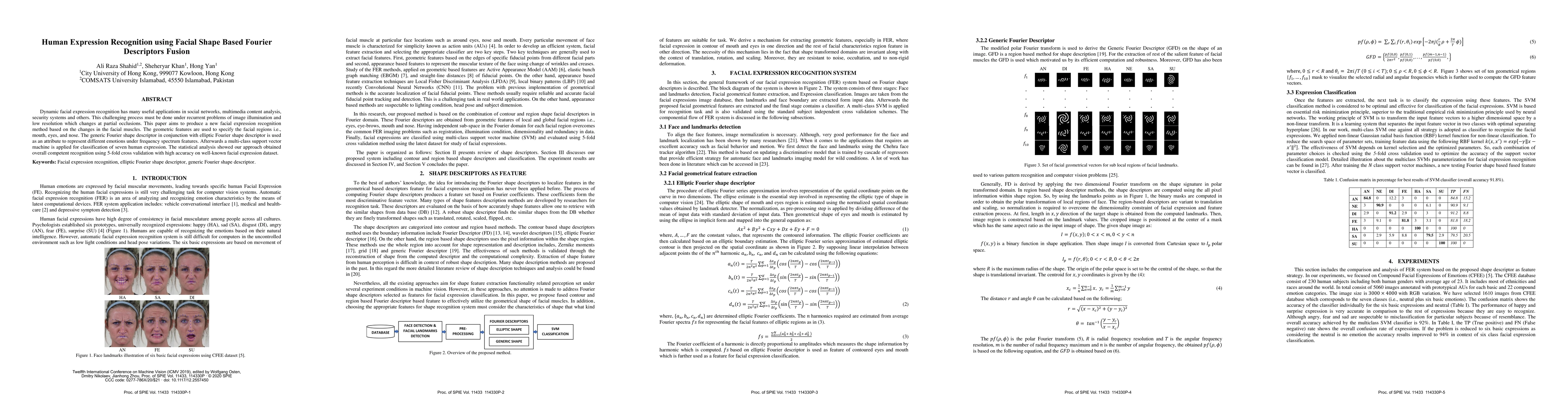 This paper proposes a novel method for dynamic facial expression recognition using Fourier descriptors fusion to handle illumination and low-resolution issues. It employs geometric features and a multi-class support vector machine for classifying seven human emotions, achieving high accuracy on a well-known dataset.
