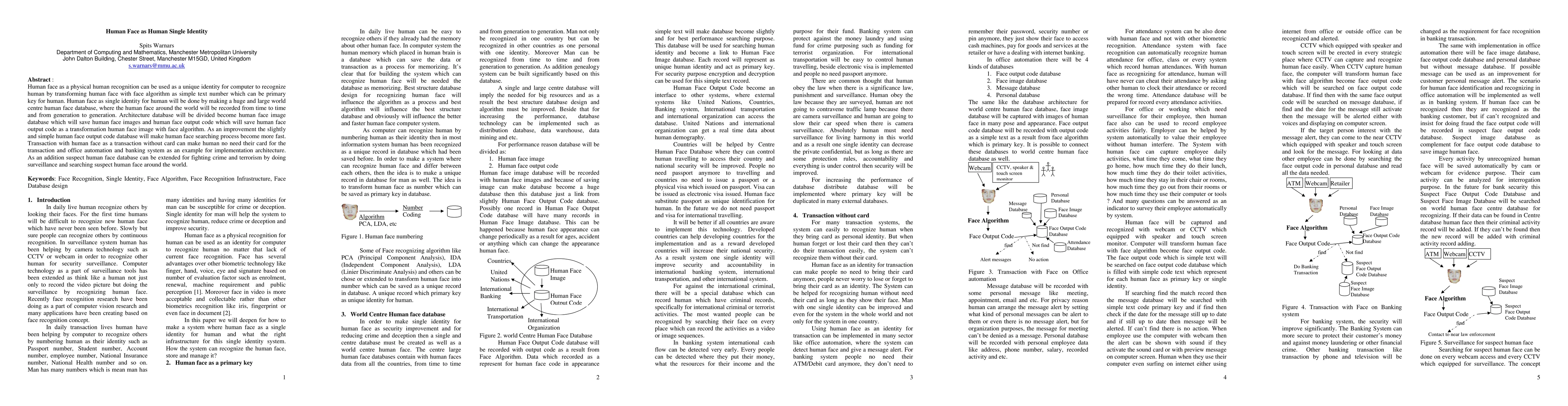 Human face as a physical human recognition can be used as a unique identity for computer to recognize human by transforming human face with face algorithm as simple text number which can be primary key for human. Human face as single identity for human will be done by making a huge and large world centre human face database, where the human face around the world will be recorded from time to time and from generation to generation. Architecture database will be divided become human face image database which will save human face images and human face output code which will save human face output code as a transformation human face image with face algorithm. As an improvement the slightly and simple human face output code database will make human face searching process become more fast. Transaction with human face as a transaction without card can make human no need their card for the transaction and office automation and banking system as an example for implementation architecture. As an addition suspect human face database can be extended for fighting crime and terrorism by doing surveillance and searching suspect human face around the world.