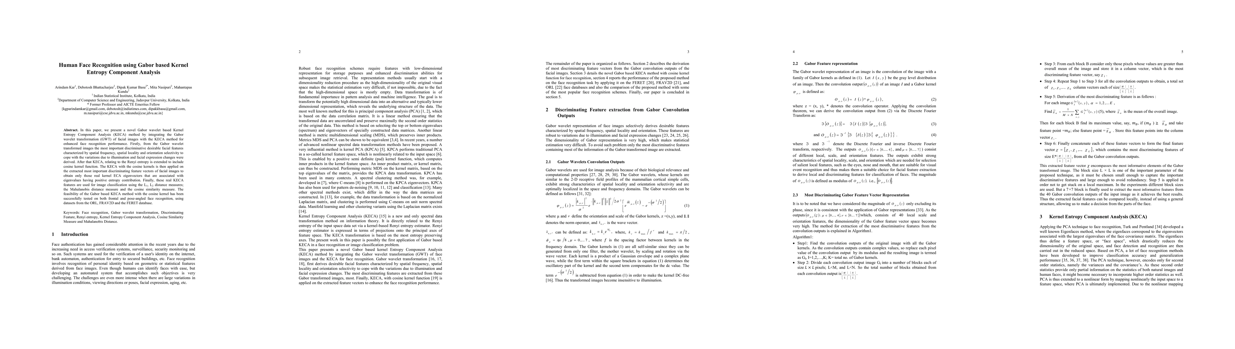 This paper introduces a novel Gabor wavelet-based Kernel Entropy Component Analysis (KECA) method for enhanced human face recognition, integrating Gabor wavelet transformation with KECA to extract discriminative facial features. The method successfully classifies faces using various distance measures and shows promising results on frontal and pose-angled face datasets.