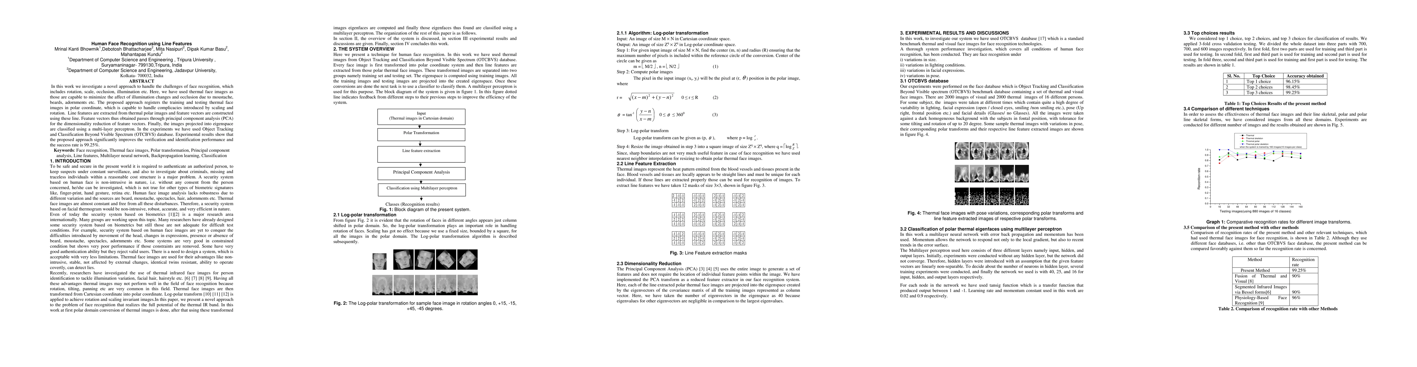 This paper proposes a novel method for human face recognition using line features extracted from thermal images, which are less affected by illumination and occlusion. The approach registers images in polar coordinates to handle scaling and rotation, followed by PCA for dimensionality reduction and classification using a multi-layer perceptron, achieving a 99.25% success rate on the OTCBVS database.