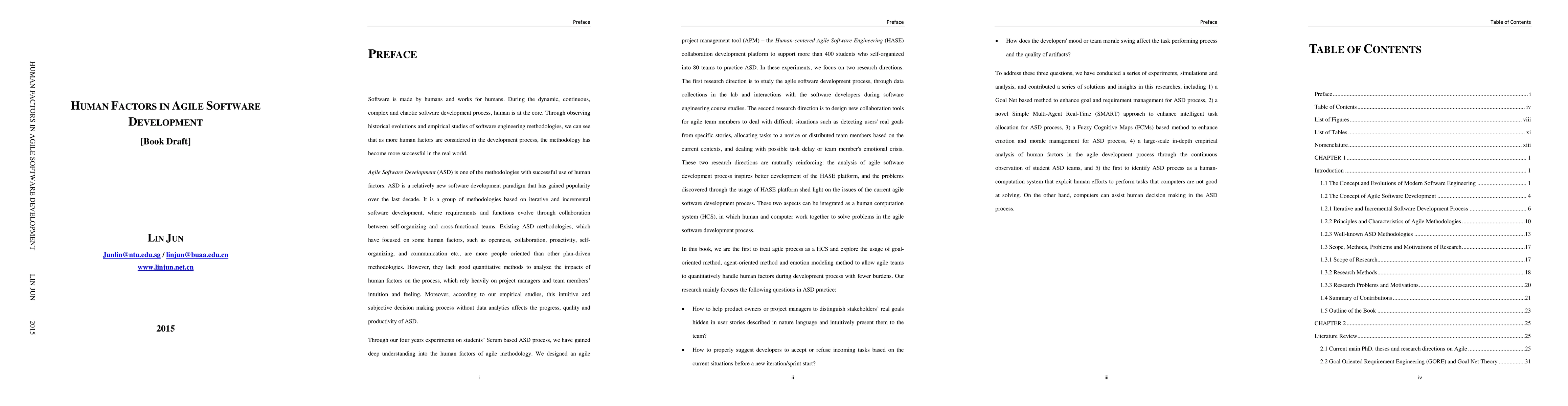 This research explores human factors in agile software development through extensive experiments with students using Scrum. The study introduces the HASE platform and presents solutions like Goal Net, SMART, and FCMs methods, along with large-scale insights into human elements in agile processes, positioning ASD as a human-computation system.