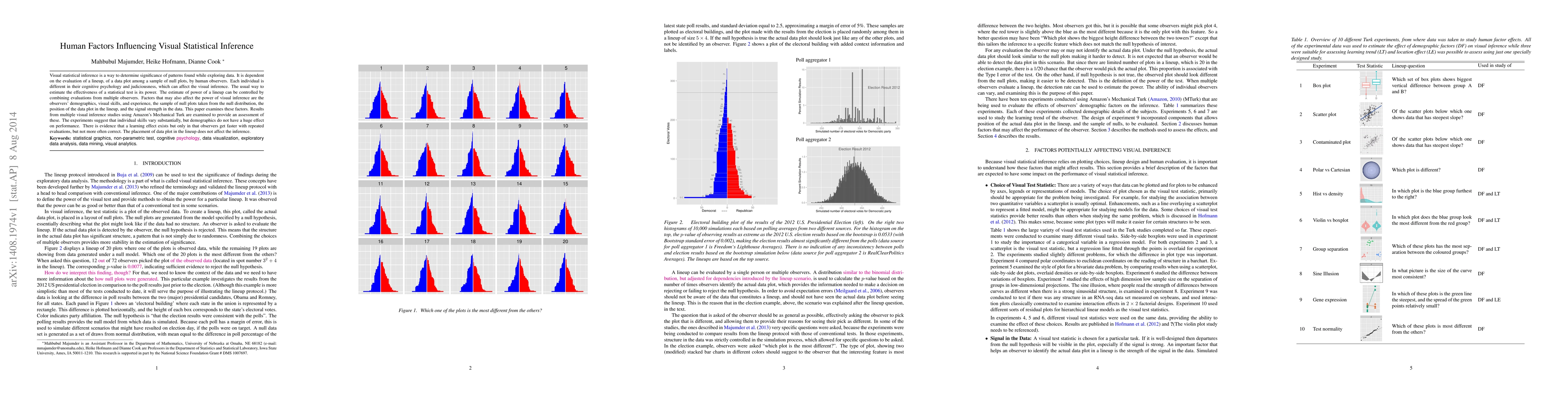 This paper examines how various factors affect visual statistical inference, finding that individual skills vary substantially but demographics have little impact on performance. Observers' experience and signal strength in the data also play a role, while the placement of the data plot in the lineup has no effect.
