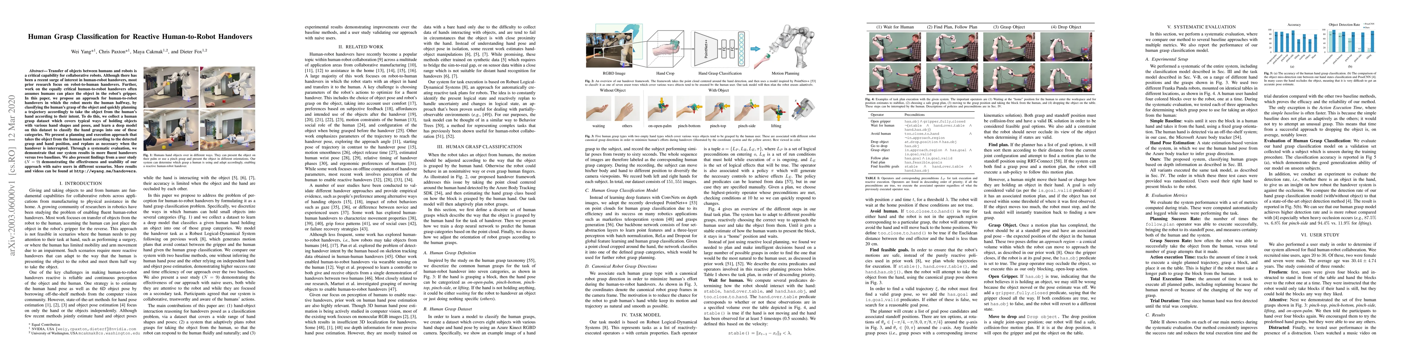 This paper proposes a method for classifying human grasps to facilitate reactive human-to-robot handovers, where the robot meets the human halfway. It introduces a deep learning model trained on a grasp dataset to classify human grasps and plans robot trajectories accordingly, resulting in more fluent handovers compared to baselines, as demonstrated through systematic evaluation and user studies.
