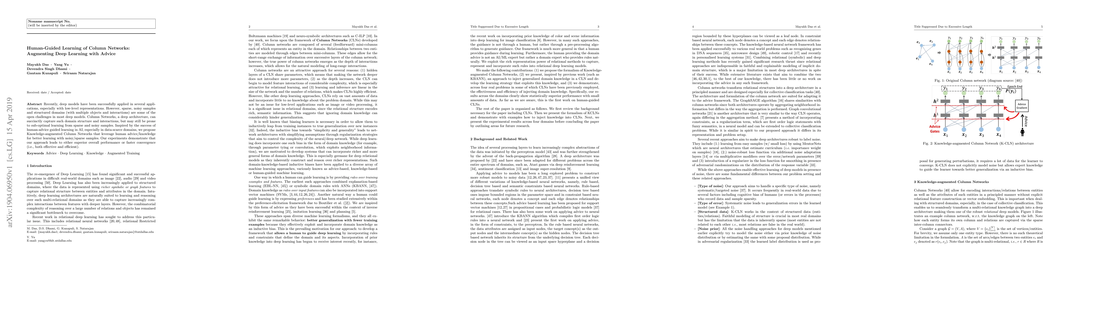 This paper proposes Knowledge-augmented Column Networks to enhance deep learning by incorporating human advice, aiming to improve learning from sparse and noisy samples. The results show either superior performance or faster convergence compared to traditional methods.