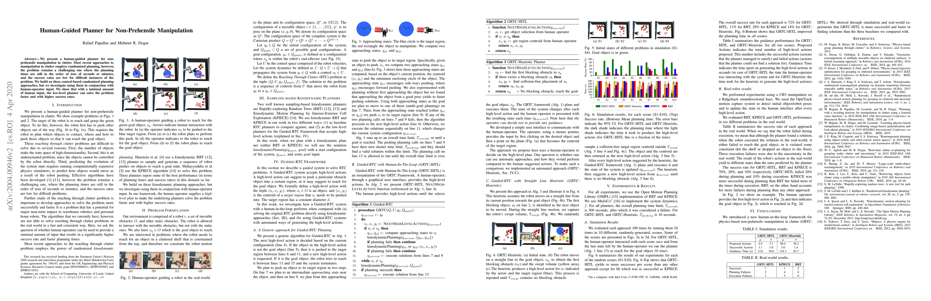 This paper introduces a human-guided planner for non-prehensile manipulation in cluttered environments, demonstrating that incorporating human input can significantly reduce planning times and increase success rates compared to randomized planning alone.