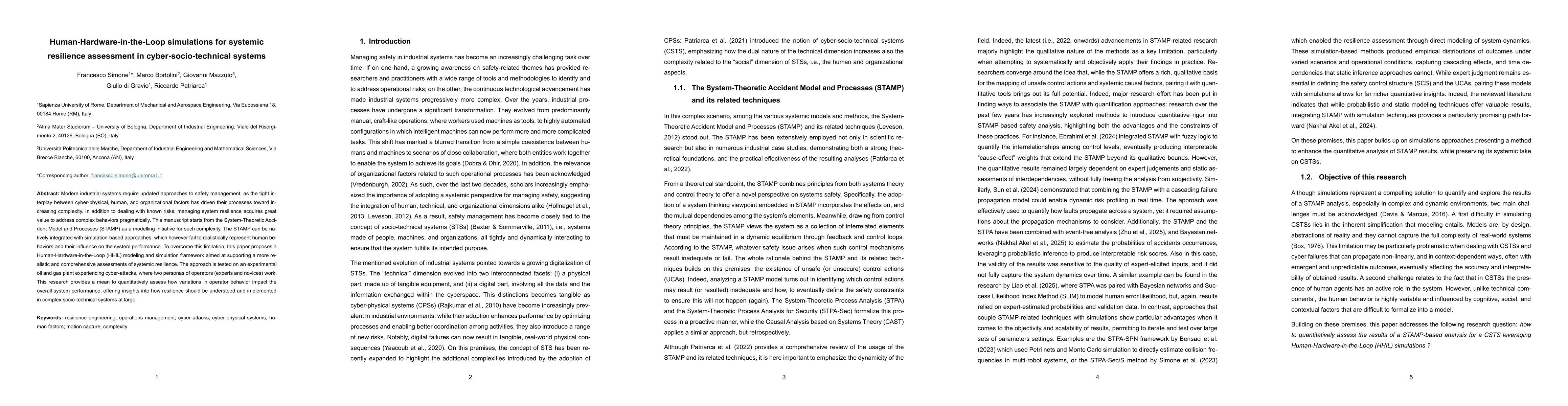 Modern industrial systems require updated approaches to safety management, as the tight interplay between cyber-physical, human, and organizational factors has driven their processes toward increasing complexity. In addition to dealing with known risks, managing system resilience acquires great value to address complex behaviors pragmatically. This manuscript starts from the System-Theoretic Accident Model and Processes (STAMP) as a modelling initiative for such complexity. The STAMP can be natively integrated with simulation-based approaches, which however fail to realistically represent human behaviors and their influence on the system performance. To overcome this limitation, this paper proposes a Human-Hardware-in-the-Loop (HHIL) modeling and simulation framework aimed at supporting a more realistic and comprehensive assessments of systemic resilience. The approach is tested on an experimental oil and gas plant experiencing cyber-attacks, where two personas of operators (experts and novices) work. This research provides a mean to quantitatively assess how variations in operator behavior impact the overall system performance, offering insights into how resilience should be understood and implemented in complex socio-technical systems at large.