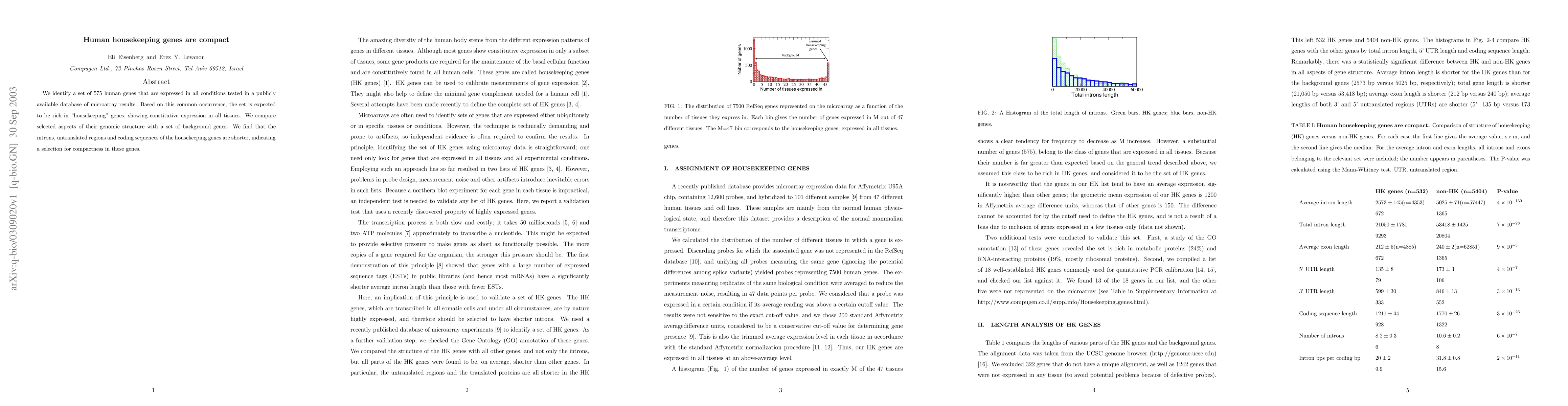 We identify a set of 575 human genes that are expressed in all conditions tested in a publicly available database of microarray results. Based on this common occurrence, the set is expected to be rich in "housekeeping" genes, showing constitutive expression in all tissues. We compare selected aspects of their genomic structure with a set of background genes. We find that the introns, untranslated regions and coding sequences of the housekeeping genes are shorter, indicating a selection for compactness in these genes.