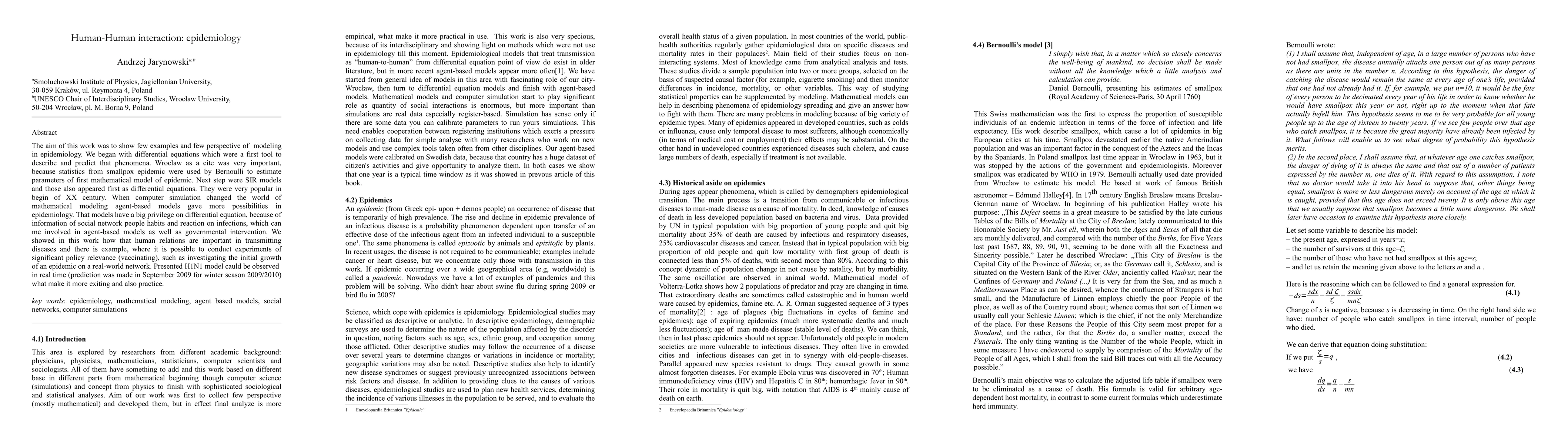 The aim of this work was to show few examples and few perspective of modeling in epidemiology. We began with differential equations which were a first tool to describe and predict that phenomena. Wroclaw as a cite was very important, because statistics from smallpox epidemic were used by Bernoulli to estimate parameters of first mathematical model of epidemic. Next step were SIR models and those also appeared first as differential equations. They were very popular in begin of XX century. When computer simulation changed the world of mathematical modeling agent-based models gave more possibilities in epidemiology. That models have a big privilege on differential equation, because of information of social network people habits and reaction on infections, which can me involved in agent-based models as well as governmental intervention. We showed in this work how that human relations are important in transmitting diseases and there is example, where it is possible to conduct experiments of significant policy relevance (vaccinating), such as investigating the initial growth of an epidemic on a real-world network. Presented H1N1 model could be observed in real time (prediction was made in September 2009 for winter season 2009/2010) what make it more exiting and also practice.
