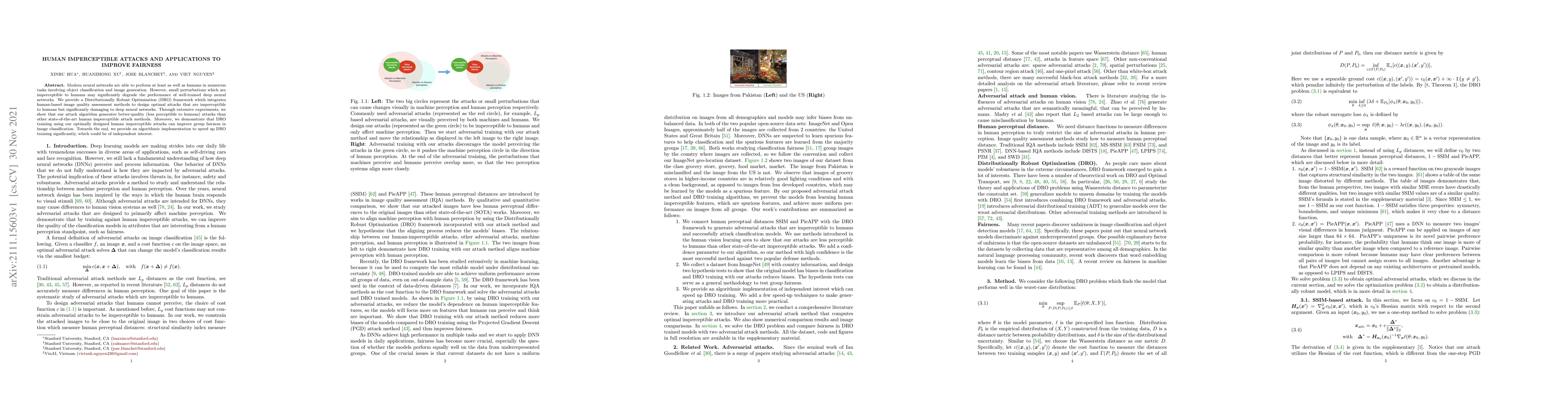 This paper introduces a Distributionally Robust Optimization (DRO) framework to design human imperceptible attacks on neural networks, which degrade network performance without being noticeable to humans. The proposed attack method outperforms existing techniques in attack quality and demonstrates that training with these attacks can enhance group fairness in image classification.
