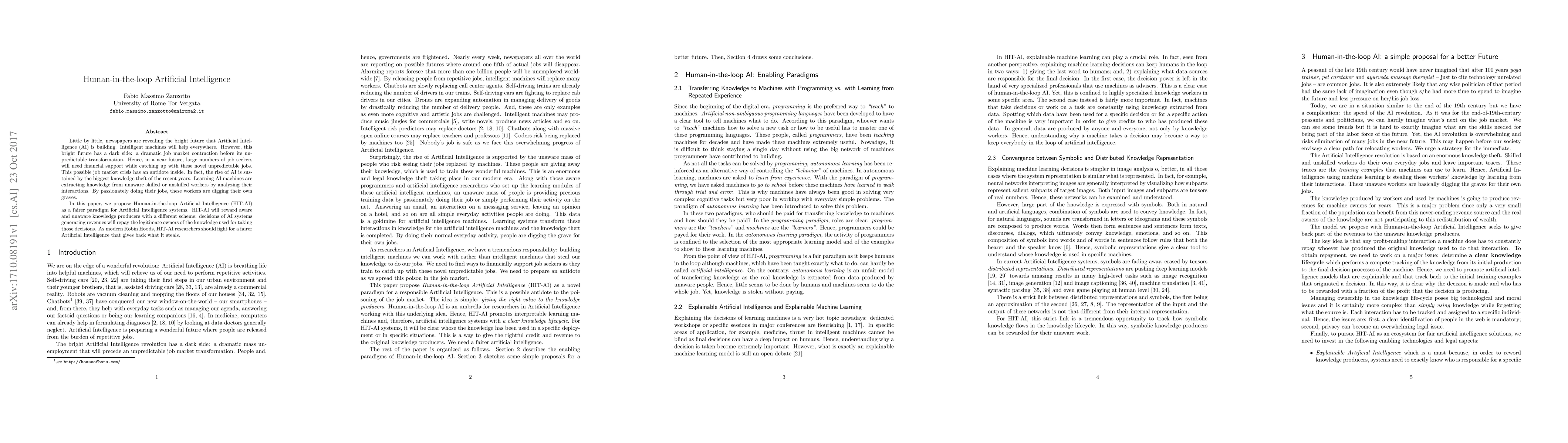 This paper proposes Human-in-the-loop Artificial Intelligence (HIT-AI) to address the job market crisis caused by AI's knowledge extraction from workers. HIT-AI aims to fairly compensate knowledge producers by repaying them when AI systems generate revenue based on their knowledge.