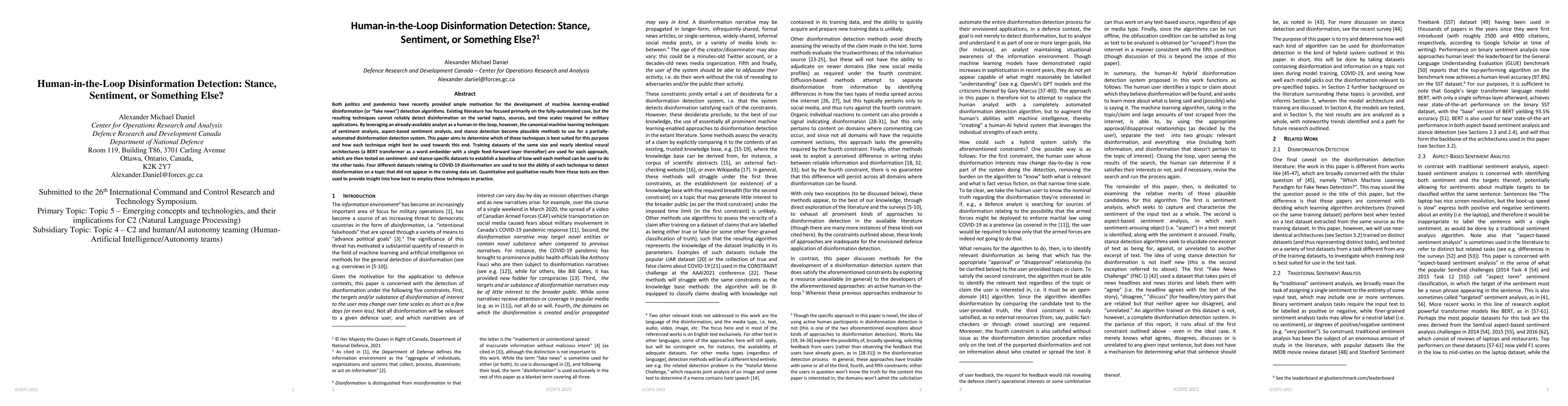Both politics and pandemics have recently provided ample motivation for the development of machine learning-enabled disinformation (a.k.a. fake news) detection algorithms. Existing literature has focused primarily on the fully-automated case, but the resulting techniques cannot reliably detect disinformation on the varied topics, sources, and time scales required for military applications. By leveraging an already-available analyst as a human-in-the-loop, however, the canonical machine learning techniques of sentiment analysis, aspect-based sentiment analysis, and stance detection become plausible methods to use for a partially-automated disinformation detection system. This paper aims to determine which of these techniques is best suited for this purpose and how each technique might best be used towards this end. Training datasets of the same size and nearly identical neural architectures (a BERT transformer as a word embedder with a single feed-forward layer thereafter) are used for each approach, which are then tested on sentiment- and stance-specific datasets to establish a baseline of how well each method can be used to do the other tasks. Four different datasets relating to COVID-19 disinformation are used to test the ability of each technique to detect disinformation on a topic that did not appear in the training data set. Quantitative and qualitative results from these tests are then used to provide insight into how best to employ these techniques in practice.