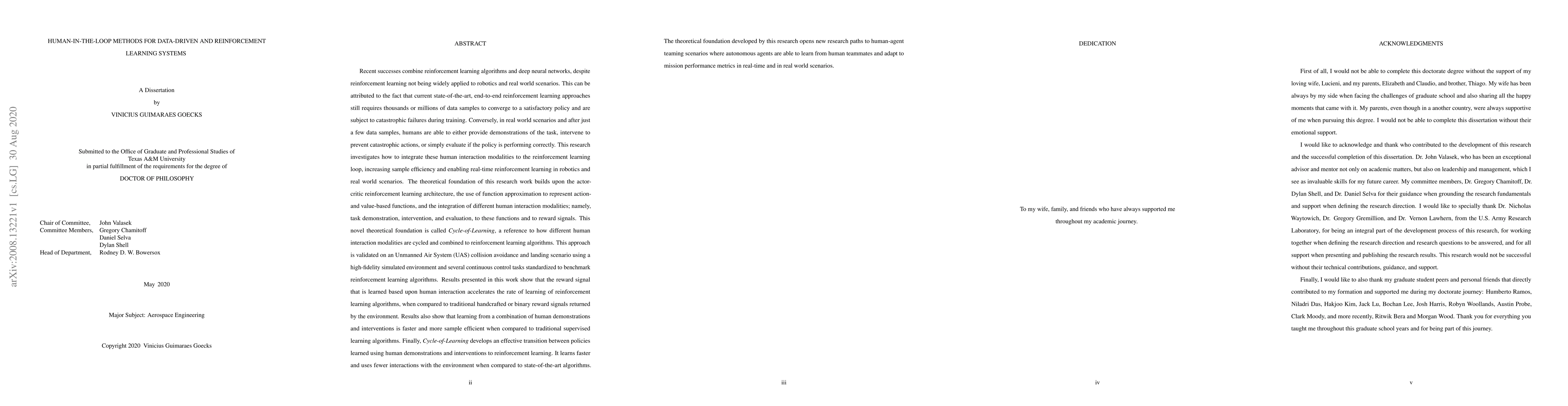 Recent successes combine reinforcement learning algorithms and deep neural networks, despite reinforcement learning not being widely applied to robotics and real world scenarios. This can be attributed to the fact that current state-of-the-art, end-to-end reinforcement learning approaches still require thousands or millions of data samples to converge to a satisfactory policy and are subject to catastrophic failures during training. Conversely, in real world scenarios and after just a few data samples, humans are able to either provide demonstrations of the task, intervene to prevent catastrophic actions, or simply evaluate if the policy is performing correctly. This research investigates how to integrate these human interaction modalities to the reinforcement learning loop, increasing sample efficiency and enabling real-time reinforcement learning in robotics and real world scenarios. This novel theoretical foundation is called Cycle-of-Learning, a reference to how different human interaction modalities, namely, task demonstration, intervention, and evaluation, are cycled and combined to reinforcement learning algorithms. Results presented in this work show that the reward signal that is learned based upon human interaction accelerates the rate of learning of reinforcement learning algorithms and that learning from a combination of human demonstrations and interventions is faster and more sample efficient when compared to traditional supervised learning algorithms. Finally, Cycle-of-Learning develops an effective transition between policies learned using human demonstrations and interventions to reinforcement learning. The theoretical foundation developed by this research opens new research paths to human-agent teaming scenarios where autonomous agents are able to learn from human teammates and adapt to mission performance metrics in real-time and in real world scenarios.