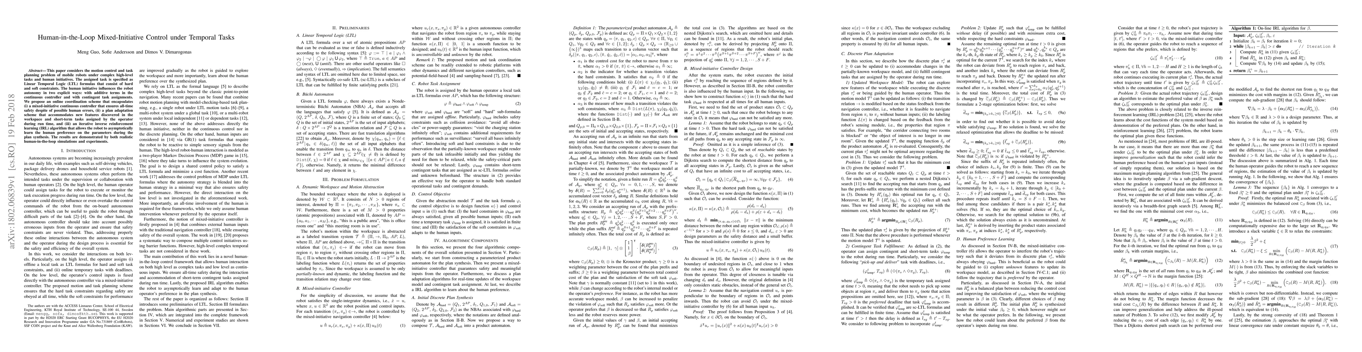This paper considers the motion control and task planning problem of mobile robots under complex high-level tasks and human initiatives. The assigned task is specified as Linear Temporal Logic (LTL) formulas that consist of hard and soft constraints. The human initiative influences the robot autonomy in two explicit ways: with additive terms in the continuous controller and with contingent task assignments. We propose an online coordination scheme that encapsulates (i) a mixed-initiative continuous controller that ensures all-time safety despite of possible human errors, (ii) a plan adaptation scheme that accommodates new features discovered in the workspace and short-term tasks assigned by the operator during run time, and (iii) an iterative inverse reinforcement learning (IRL) algorithm that allows the robot to asymptotically learn the human preference on the parameters during the plan synthesis. The results are demonstrated by both realistic human-in-the-loop simulations and experiments.