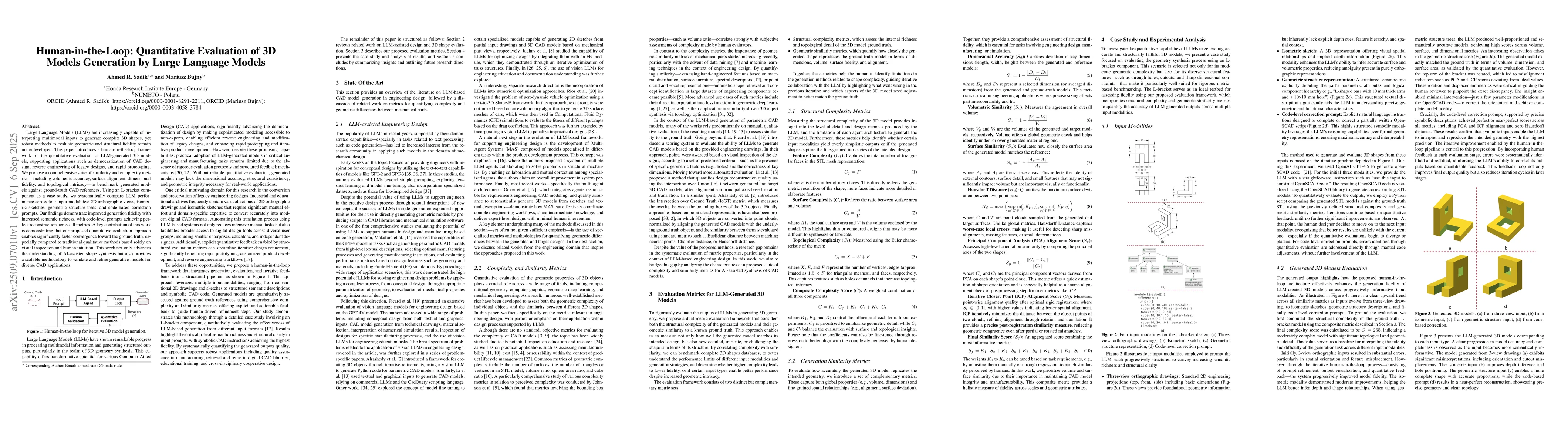 Large Language Models are increasingly capable of interpreting multimodal inputs to generate complex 3D shapes, yet robust methods to evaluate geometric and structural fidelity remain underdeveloped. This paper introduces a human in the loop framework for the quantitative evaluation of LLM generated 3D models, supporting applications such as democratization of CAD design, reverse engineering of legacy designs, and rapid prototyping. We propose a comprehensive suite of similarity and complexity metrics, including volumetric accuracy, surface alignment, dimensional fidelity, and topological intricacy, to benchmark generated models against ground truth CAD references. Using an L bracket component as a case study, we systematically compare LLM performance across four input modalities: 2D orthographic views, isometric sketches, geometric structure trees, and code based correction prompts. Our findings demonstrate improved generation fidelity with increased semantic richness, with code level prompts achieving perfect reconstruction across all metrics. A key contribution of this work is demonstrating that our proposed quantitative evaluation approach enables significantly faster convergence toward the ground truth, especially compared to traditional qualitative methods based solely on visual inspection and human intuition. This work not only advances the understanding of AI assisted shape synthesis but also provides a scalable methodology to validate and refine generative models for diverse CAD applications.