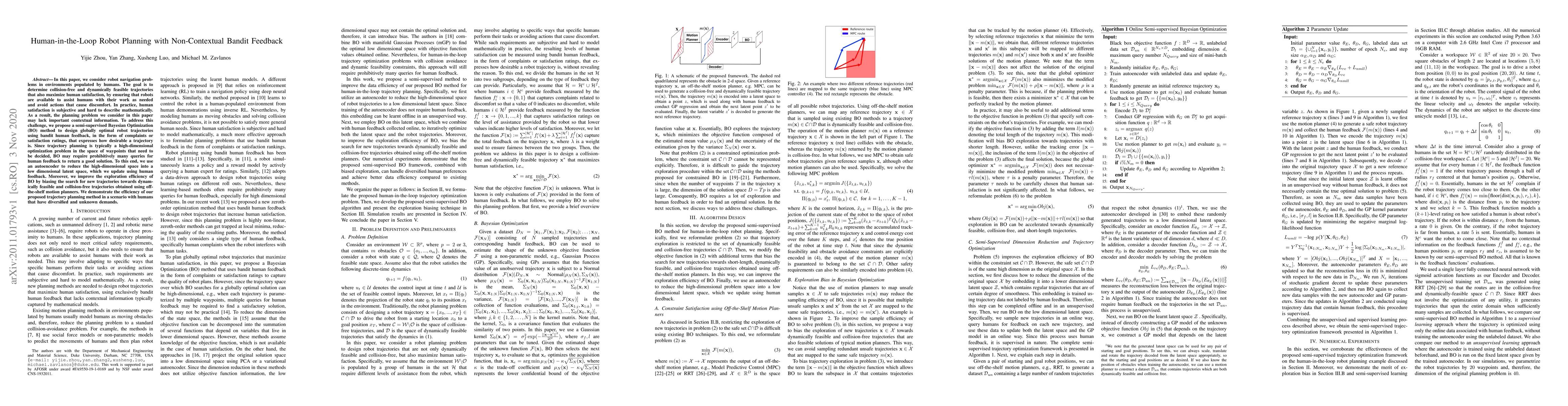 This paper proposes a semi-supervised Bayesian Optimization method for human-in-the-loop robot planning in environments with humans, using non-contextual bandit feedback to maximize human satisfaction. It employs an autoencoder to reduce the high-dimensional trajectory space and enhances exploration efficiency by leveraging off-the-shelf motion planners.