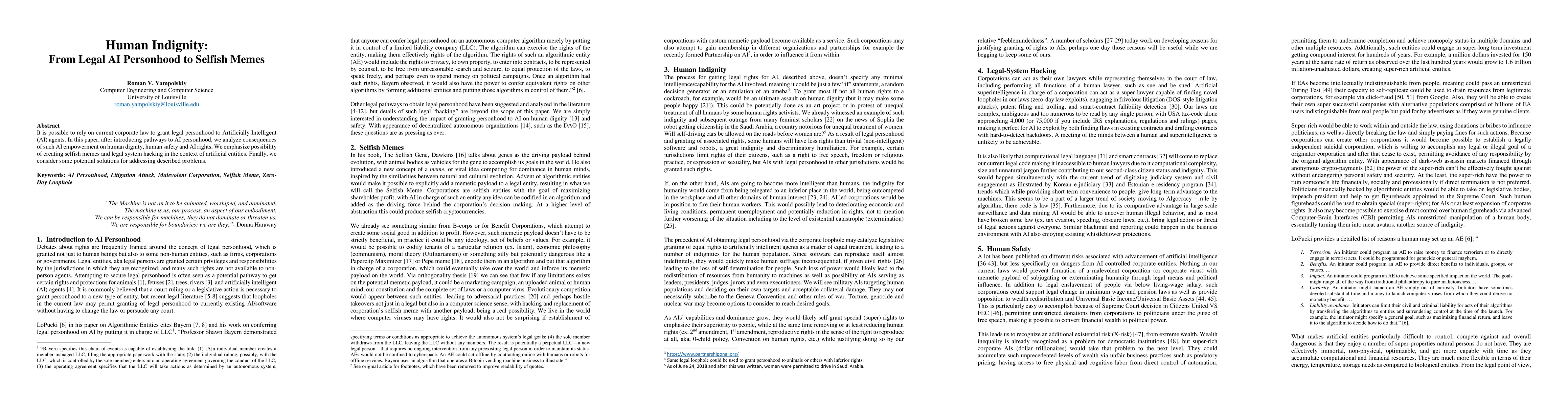 It is possible to rely on current corporate law to grant legal personhood to Artificially Intelligent (AI) agents. In this paper, after introducing pathways to AI personhood, we analyze consequences of such AI empowerment on human dignity, human safety and AI rights. We emphasize possibility of creating selfish memes and legal system hacking in the context of artificial entities. Finally, we consider some potential solutions for addressing described problems.