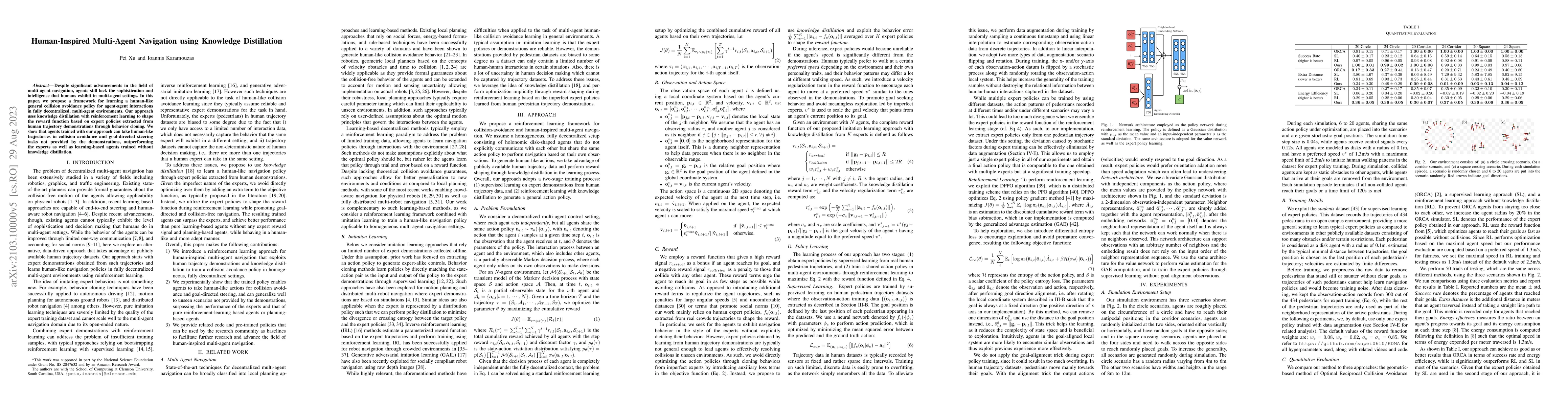 This paper proposes a framework using knowledge distillation and reinforcement learning to teach multi-agent systems human-like collision avoidance skills. Agents trained with this method outperform both human experts and other learning-based agents in navigating complex environments.