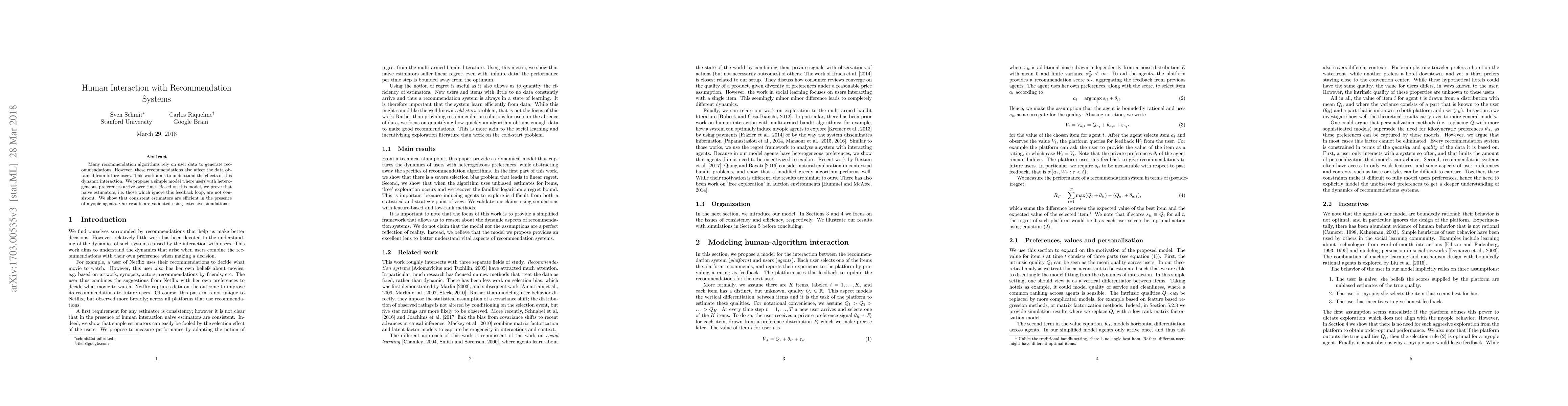 Many recommendation algorithms rely on user data to generate recommendations. However, these recommendations also affect the data obtained from future users. This work aims to understand the effects of this dynamic interaction. We propose a simple model where users with heterogeneous preferences arrive over time. Based on this model, we prove that naive estimators, i.e. those which ignore this feedback loop, are not consistent. We show that consistent estimators are efficient in the presence of myopic agents. Our results are validated using extensive simulations.