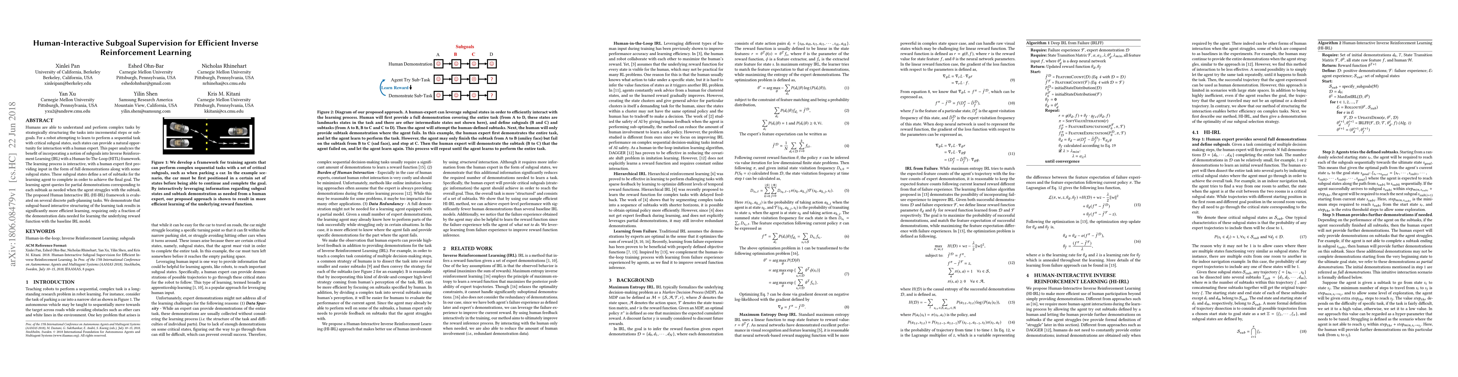 This paper proposes a Human Interactive Subgoal Supervision framework for Inverse Reinforcement Learning (HI-IRL), where human experts provide subgoals and partial demonstrations to guide the learning process. The approach significantly enhances learning efficiency by requiring only a fraction of the demonstration data compared to baseline models.
